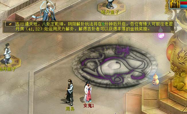 2.每天19:05系统会发出铃铛公告温馨提示大家前往老君丹房,作好抽奖准备。 更多游戏资讯请访问叶子猪游戏资讯中心:http://news.yzz.cn/ |