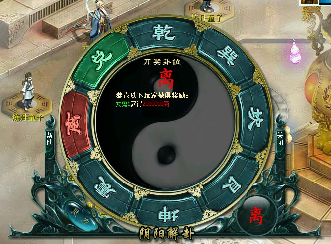4.押好注之后,静静等待倒计时结束进行开奖。开奖过程中红色的主卦和绿色的客卦会各自旋转,主卦和客卦重合的时候将会呈现金黄色。开奖结果将会用红色字体显示在转盘界面中。 很幸运,第一次押注就押中了吉位!200万大话币开开心心收入囊中! 开奖后,获奖名单将会显示在转盘界面中央。查看完大家的获奖情况,稍作休整,我们继续押注! 喔!真是时来运转,这次不仅押注了吉位,而且客卦与主卦重合,呈现出金黄色的大吉之象,获得的奖励翻倍了!400万大话币笑纳了还不止这些,开中大吉位触发天女散花,地上掉落大量金色宝盒,赶紧关闭界面抢宝盒去!每个盒子蕴藏10万大话币,真是一笔不小的收入!这么多宝盒没人跟我抢,真开心。 温馨提示:阴阳解卦玩法将在9月5日于试玩服放出试玩,9月12日局部测试,9月19日全服放出。玩法放出后,长安矿石收购商人处将不再收取宝石和炼妖石,各级宝石炼妖石可交给周易兑换灵力抽取金钱。 <<<点击进入新大话西游2论坛讨论>>> 更多游戏资讯请访问叶子猪游戏资讯中心:http://news.yzz.cn/ [编辑:Da吉他]