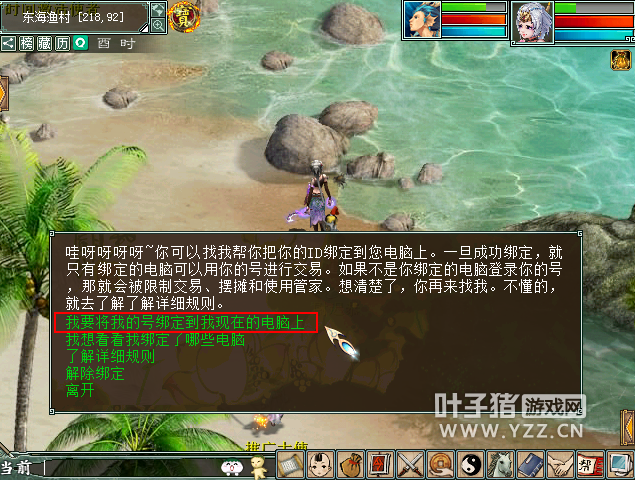 游戏ID绑定电脑功能,是《大话Ⅱ》提供给大家除了密保产品之外的一种安全保护方式。此功能的目的,是增加一个保护玩家虚拟财产的保护方式。 玩家将自己的ID绑定到电脑上之后。在任何一台非绑定的电脑上,均无法进行交易、给予、管家、摆摊的操作。但是其它游戏行为(例如日常升级、节假日活动等)不被限制。只有在绑定的电脑上,才允许做上述相应的操作。 绑定:为了方便大家更好的游戏,我们开放了多台电脑绑定的功能。在游戏中,玩家找NPC绑定。并可以通过NPC,进行增绑多台电脑。 解绑:可以在绑定的电脑上申请解绑,也可以在非绑定电脑上申请解绑。有申请时间,前者为3天,后者为7天。 图例: 1、到东海渔村(133,112)找到尉迟公申请绑定。 2、在解除高级锁之后,为绑定的电脑起个名字。