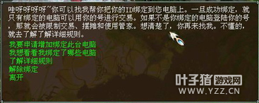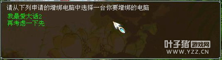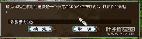 3、选择确定之后,就绑定成功了。并且可以在NPC处,查询绑定的电脑名字。 4、如果要增绑的话,需要到另外一台电脑上申请,并输入名字。 增绑输入名字 5、在已绑定电脑上批准绑定。 6、增绑完成。