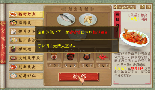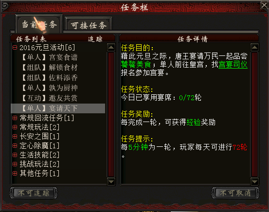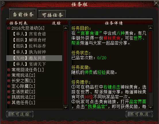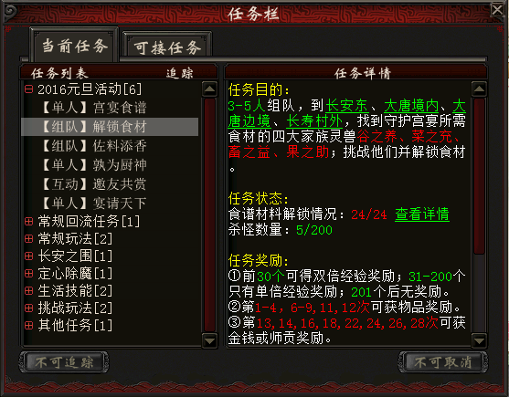 2016元旦活动新玩法:饕餮美食,由我主厨。 活动日期:2016年1月1日-2016年1月3日。丰富的单人玩法和组队玩法,欢迎广大玩家踊跃参与。 单人·宫宴食谱 活动背景 走访那些民间厨艺高手,了解相应烹调技巧后,将宫宴食谱中列出的八道菜逐一解锁。成功解锁菜谱后,才能在“宫宴食谱”界面中制作菜肴。 活动时间 2016年1月1日0:00-2016年1月3日23:59 活动条件 人物等级≥30级,时间宠≥10级 活动场景 长安城、洛阳城、东海渔村、傲来国、大唐边境 活动流程 2跑路对话完成任务 根据任务栏的提示,拜访与每道菜肴相关的民间厨艺高手与相关人士,获得相应的烹调技巧,完成任务。 3.完成任务获得奖励 成功解锁一道菜,即得一次经验奖励,总共可以获得八次经验奖励 组队·解锁食材 活动背景 宫宴所需食谱材料,分别由谷之养、菜之充、畜之益、果之助四大灵兽守护着,找到他们进行挑战,解锁《宫宴食谱》中所需要的食谱材料。 活动时间 2016年1月1日0:00-2016年1月3日23:59 活动条件 人物等级≥30级,时间宠≥10级 活动场景 长安东、大唐境内、大唐边境、长寿村外 活动流程 1.寻找四大家族灵兽 3-5人组队,前往长安东、大唐境内、大唐边境或长寿村外。 寻找四大家族灵兽(谷之养、菜之充、畜之益、果之助),挑战他们并解锁食材。 2挑战四大家族灵兽 与灵兽的战斗中,会出现1-2个“宫宴食材”。 2回合内杀死宫宴食材便可随机解锁食材,解锁食材的数量与杀死宫宴食材数量有关; 每个菜谱所需食材全部解锁后,才可制作该菜肴。 3战斗胜利获得奖励 成功进行挑战,获得战斗胜利,则获得奖励。 奖励包括物品奖励、经验奖励、道具奖励和金钱师贡奖励。 若战斗中杀死宫宴食材,则可以对应解锁食材。 活动奖励