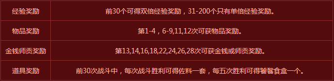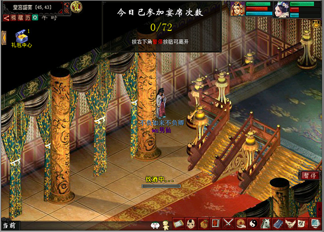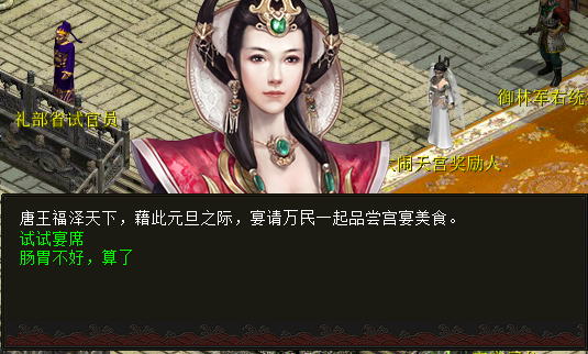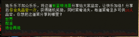组队·佐料添香 活动背景 前往天宫找到四位掌管美食的神君,向其请教如何做出色香味俱全的饕餮美食,获得合成菜式必需的佐料。在制作菜肴时添加不同用量的佐料,可变化菜肴的口味。 活动时间 2016年1月1日0:00-2016年1月3日23:59 活动条件 人物等级≥30级,时间宠≥10级 活动场景 天宫 1寻找四位神君 3-5人组队,前往天宫,逐一挑战等候在那里的四位神君 色之君、香之君、味之君和食之神。 3战斗胜利获得奖励 每位神君只有首次成功挑战可获得经验奖励和贵重物品奖励,二次及以上挑战无奖励 每成功挑战一位神君,将获得用于合成菜肴的佐料五套。 活动奖励 单人·宴请天下 活动背景 藉此元旦之际,唐王宴请万民一起品尝饕餮美食;单人前往皇宫,找宫宴司仪报名参加宫宴。 活动时间 2016年1月1日0:00-2016年1月3日23:59 活动条件 人物等级≥30级,时间宠≥10级 活动场景 皇宫盛宴 3得经验奖励 每享用一轮皇宫宴席,可获得1次经验奖励;每天最多可获得72次经验奖励。 单人·孰为厨神 活动背景 内容找到正在皇宫的典膳、掌膳、典酝、掌酝、典药、掌药、典饎、掌饎等八位美食家,根据他们的独特喜好,在宫宴食谱中烧出最合他们胃口的菜来。 活动时间 2016年1月1日0:00-2016年1月3日23:59 活动条件 人物等级≥30级,时间宠≥10级 活动场景 皇宫 1制作菜肴 当菜谱及其食材全部解锁后,打开任务道具栏中的“宫宴食谱”可进行菜肴制作。 制作时需添加1-4种佐料,菜肴的口味根据添加的佐料用量比例而不同。 2提交菜肴 分别与皇宫内的八位美食家对话,判断其喜欢的菜肴及口味,做出相应的菜肴供品尝,可获得评分。 位美食家品尝菜肴不设上限,每次品尝可刷新评分,系统只保留最高分。 3获得奖励 活动期间,八位美食家每天首次品尝菜肴可获得物品奖励和经验奖励,每天最多可以获得八次奖励。 活动结束后,评分排行榜总分前三者可获得丰厚物品奖励和为期一月的称谓。 互动·邀友共享 活动背景 举国欢庆,与好友一起分享美食!玩家在制作八种美食时,有一定几率额外获得一份神秘美食;神秘美食可在世界或帮派频道中分享,一起品尝,一起拿奖! 活动时间 2016年1月1日0:00-2016年1月3日23:59 活动条件 人物等级≥30级,时间宠≥10级 活动场景 世界、帮派频道 2分享神秘美食 右键点击物品栏中的任何一个神秘美食,可选择世界或帮派频道分享。 分享后自己获得奖励,道具消失。 3品尝神秘美食 玩家可以在世界或者帮派频道中找到他人分享的神秘美食,点击频道中的美食链接,即可打开品尝界面.。 点击“我要品尝”按钮,即可获得随机师贡或者经验奖励。当然也会触发一些神秘事件。 4获得品尝奖励 每道神秘美食可供10位不同玩家品尝一次,可获得师贡或者经验奖励。 每人每天最多可品尝20次的神秘美食。 组队·隐藏事件 活动背景 玩家在佐料添香任务中成功挑战任意三个boss,可触发隐藏事件。触发后,3-5人组队,找到在天宫(99,86)的尚食,与其对话后进入食材幻境,开启玩法。 活动时间 2016年1月1日0:00-2016年1月3日23:59 活动条件 人物等级≥30级,时间宠≥10级 活动场景 食材幻境 1触发隐藏事件 玩家组队状态下,击败任意三位神君,会触发隐藏事件。 3-5人组队,找到在天宫(99,86)的尚食,与其对话后进入食材幻境,开启玩法。每天只可进入一次,离开场景后将不可再进入。 2开启隐藏事件 进入食材幻境场景后,需找宫食储备人(15,25)确认挑战,全部队员确认后,自动散队,5分钟倒计时开始。 3进行隐藏事件 需要将场景上方的食材拉到场景下方对应的美食NPC处即可获得一次经验奖励, 给错了可是没有奖励的;每人最多可以完成20次。 4获得经验奖励 每完成一次拉怪,即得一次经验奖励。每人每天最多可以获得20次经验奖励。 <<<点击进入大话西游2论坛讨论>>> [编辑:米奈]