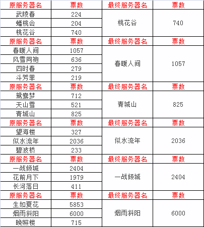 为提高服务器人气,改善玩家游戏体验,大话西游2经典版将在2018年9月27日进行2018年度第3次服务器合并 经过近一周的投票,现将投票结果公布如下。 是否支持合服投票统计:第1组: 武陵春 合服支持率为: 92.77% 蟠桃会 合服支持率为: 83.23% 第2组: 春暖人间 合服支持率为: 98.39% 风雪同袍 合服支持率为: 96.01% 四时春 合服支持率为: 91.46% 第3组: 鸳鸯梦 合服支持率为: 93.80% 天山雪 合服支持率为: 97.14% 第4组: 望海楼 合服支持率为: 91.40% 似水流年 合服支持率为: 96.72% 第5组: 一战倾城 合服支持率为: 93.35% 花前月下 合服支持率为: 97.01% 第6组: 生如夏花 合服支持率为: 97.43% 烟雨斜阳 合服支持率为: 98.34% 服务器名投票统计: