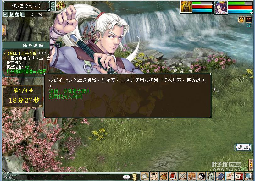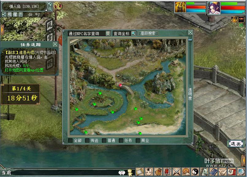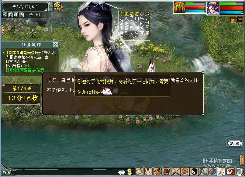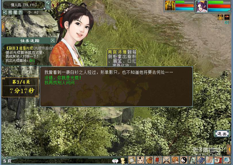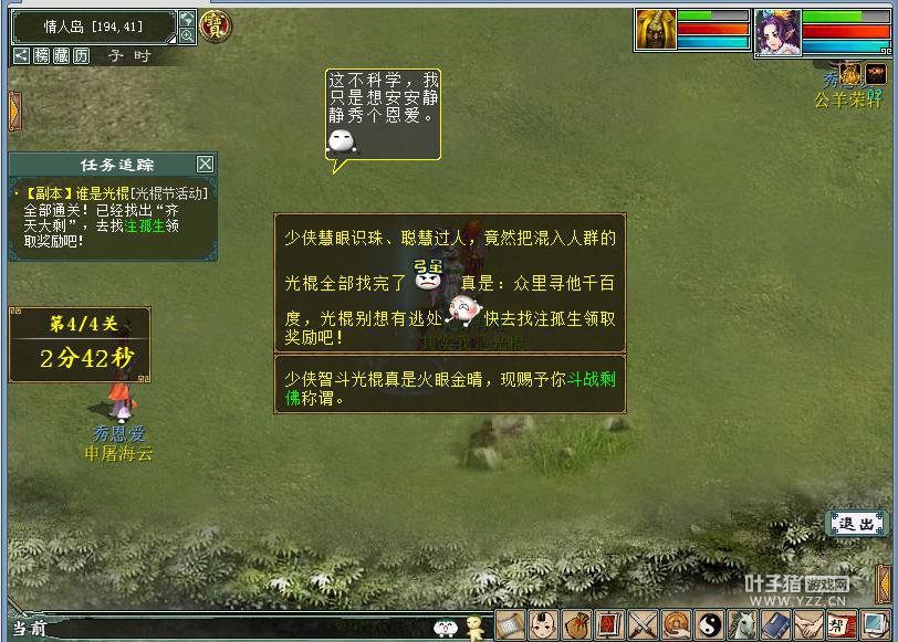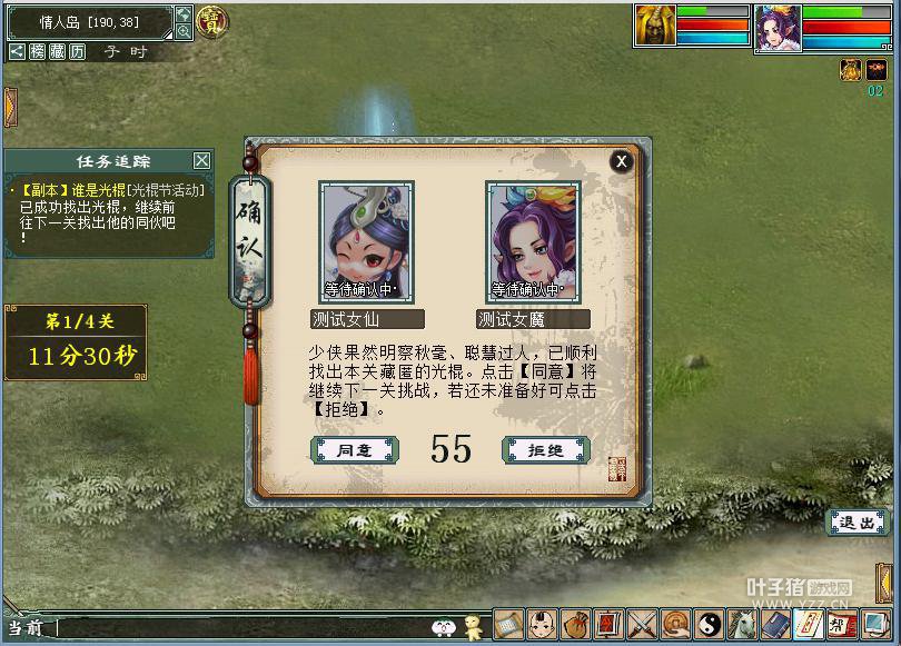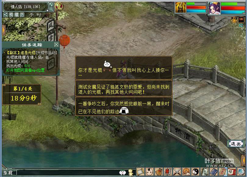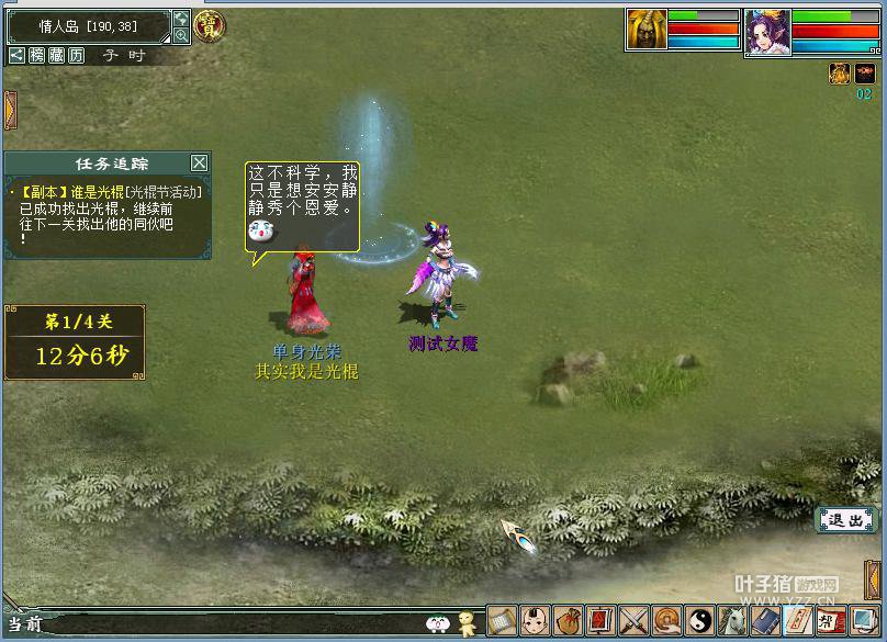 背景条件三藏法师从西天取得真经回来,开坛说法,一时间佛光普照东土。 有长安人士名叫注孤生,听了三藏讲经,只觉得众苦之中,情痴最难解。因此立下宏愿,要普渡天下光棍。于是自命每年11月11日为光棍节,在此一天中,要用其所能度化天下光棍。只是有些情侣太过高调,光棍节这天都不放过广大单身人士,还要高调秀恩爱,是需要规劝一下了;还有些光棍,忿忿于自己没有女朋友,故意去给情侣们捣乱,这也是不可取的。少侠可否去帮助注孤生分忧? 参与条件角色等级≥0转30级 时间宠≥10级 活动时间2018年11月10日00:00--11月11日23:59 活动一【副本】谁是光棍光棍节到了,看到其他人身着各色光彩鲜亮的情侣装出双入对,流落于长安大街的剩男剩女们心里很羡慕。为了避免尴尬,于是他乔装打扮,混入了长安东情人岛等地去过节。而你,作为一名美丽与智慧并存,英雄与侠义化身的大侠,怎么能容忍这种事情出现。真相只有一个,去找出那个光棍,揭穿他吧! 1、 到长安(295,187)找注孤生进入副本。副本为2人限时闯关玩法,总共分为4关,难度会根据关卡数逐步增加,在时间用完之前要尽可能通过更多关卡以获得更好的奖励。 2、 进入副本后两个人会被分散到副本任意位置,两人会共享任务进度和小地图上的提示。通过小地图可以查看NPC的位置,找到NPC对话即可获取线索。秀恩爱的情侣有可能看到过光棍,所以会透露光棍的信息,也有可能没看到只会说自己情侣的信息。需要大家根据线索仔细斟酌,多利用小地图提示,以及和队友交流分享线索可以事半功倍哦!