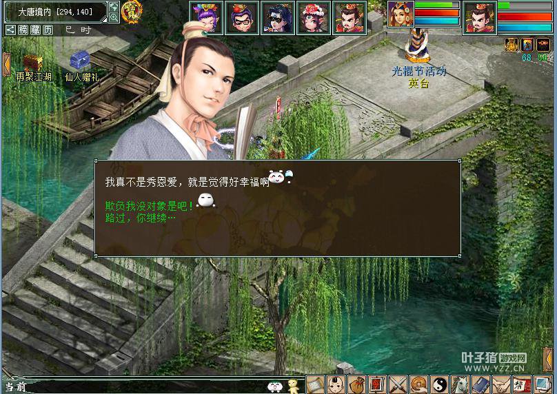 6、 每日副本不限次数,如对成绩不满意可以重置后再进,但只能领取2次奖励。 活动二【组队】棒打鸳鸯真是赤裸裸的挑衅,原本属于光棍的狂欢,结果总有人要过来秀恩爱,单身贵族表示不服!可3-5人组队,前往大唐境内、大唐边境、长寿村外、北俱芦洲等地拆散他们吧! 1、 3人以上组队后,前往大唐边境,大唐境内,长寿村外,北俱芦洲阻止这群疯狂的情侣:山伯与英台,牛郎与织女, 采臣与小倩啦。你瞧这股恋爱的酸臭味,是不是忍不住要动手了! 2、 战斗胜利后,有可能吓跑一对对秀恩爱的情侣获得奖励。