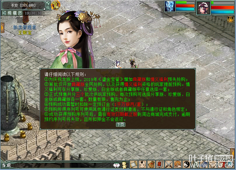 典藏钜献,感恩同行,2019鎏金宝鉴预售开启!7月25日19:30,玩家朋友们可以提前抢购典藏版鎏金宝鉴,这可以是十七周年专属推出的版本哦,限量发售,先到先得!另外,获得情义预购资格的朋友们可以在当天选择自己心仪的任一版本鎏金宝鉴进行购买。这里给大家带来了一份超级详细的鎏金宝鉴抢购指南,助你熟悉流程,购买无忧! 2019鎏金宝鉴预售指南 玩家可于7月25日19:30前往长安(265,188)找大话2周年庆大使进行鎏金宝鉴预约购买。建议提前上线,以避免网络拥堵哟! 1、在可购买鎏金宝鉴时间段玩家点击大话2周年庆使者可选择预约购买2019《鎏金宝鉴》,非购买时间则无法看见此条选项,敬请注意; 2、本次预购对拥有情义回馈购买资格的玩家开放所有版本预约购买,而对无相关资格的玩家仅开启典藏版鎏金宝鉴预约购买,同时购买一套鎏金宝鉴需暂时扣除1000万银两作为押金,付款成功后可在相关时间段找大话2周年庆使者进行退还,请大家一定要准备好足够的银两哟! 3、鎏金宝鉴版本选择,拥有情义回馈购买资格的玩家和非情义回馈购买资格的玩家将会看到不同的界面; (1)玩家朋友们可以选择购买典藏版鎏金宝鉴; (2)获得情义预购资格的玩家可选择任一规格购买,但是仅能选择一款,同时选定后在正式抢购期间不得再次购买该规格,敬请注意; 4、点击预购后记得确认购买,以免失去享受相关福利的机会; 5、成功购买后提示如下,恭喜各位成功预购2019年鎏金宝鉴! 6、抢购成功获得序列号后,在NPC选项中点击“已成功预购,前往商城支付”,前往大话2周边商城完成支付; 7、登录大话2周边商城,填写收货人信息; 8、选择购买的客户端版本,填写获得的预订序列号,通过手机验证后,可使用网易宝、支付宝或微信完成支付。 9、支付成功后,进入“我的订单”页面,在订单右侧点击“鎏金宝鉴”,输入账号绑定的将军令动态密码,即可查看2019鎏金宝鉴激活序列号,还请玩家朋友们妥善保管将军令动态密码哦! 温馨提示: (1)付款成功后实物周边和虚拟激活码将分开发放,实物周边将邮寄到您填写的收货地址,2019鎏金宝鉴激活序列号可在大话2周边商城订单中查看,激活序列号可在2019年8月15日10:00之后在游戏中激活。 (2)由于可动主角模型高度仿真,对制作工艺要求高,故制作时间较久,我们将会在9-12月分批陆续发出(可动主角模型将有单独礼盒包装寄送,不影响鎏金宝鉴礼盒9月份的发货时间),请购买典藏版的玩家朋友耐心等候。 (3)请玩家保管好自己的序列号,谨防信息泄露,避免账号共享、晒图等原因造成损失。 请认真阅读以上说明,警惕不法分子乘虚而入,防止上当受骗哦! 7月25日19:30,十七周年典藏版鎏金宝鉴,等你来抢购! [编辑:叶子猪小秘书]