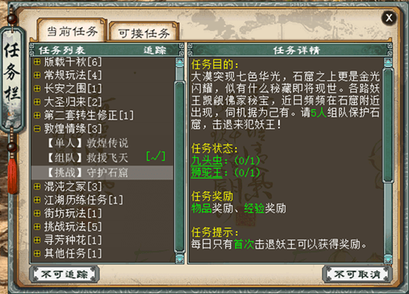 【前置任务】敦煌之光 1. 【活动时间】 2019年11月7日10:00至11月27日23:59 2. 【参与条件】 等级大于等于30级,时间宠大于等于10级 3. 【活动背景】 地龙惊动,大漠突现异象,七色华光弥漫天际。与NPC对话,了解异象发生时的境况,并探询异象背后的秘密。 4. 【活动流程】 活动开启后会获得任务敦煌之光,按指引到平顶山找寻亚里坤,活动期间首次在进入平顶山场景时会播放剧情动画 继续按任务指引找平顶山众人了解大漠异象、七彩华光的缘由,同时会获得任务问询异象 找万晓生了解异象由来(如果期间任务中断或超时,可找站岗小妖重新领取任务) 找袁天罡衍算天机之后,再找万晓生商议对策,同时开启其它任务 5. 【活动奖励】 该任务在活动期间仅可以完成一次 【组队】救援飞天 1. 【活动时间】 2019年11月7日10:00至11月27日23:59 需要完成敦煌之光前置任务后才会开启 2. 【参与条件】 等级大于等于30级,时间宠大于等于10级 3. 【活动场景】 长安东、大唐境内、五指山、大唐边境 4. 【活动背景】 前去守卫石窟的飞天们,被小妖们缠斗困在了长安东、大唐境内、五指山、大唐边境,快去帮助他们。 5. 【活动流程】 前往各地找寻被困的飞天 6. 【活动奖励】 1.每天前20次可得经验奖励,偶数次得物品奖励。 2.20次之后无任何奖励。 【挑战】守护石窟 1. 【活动时间】 2019年11月7日10:00至11月27日23:59 需要完成敦煌之光前置任务后才会开启 2. 【参与条件】 等级大于等于30级,时间宠大于等于10级 3. 【活动场景】 平顶山 4. 【活动背景】 各路妖王觊觎秘宝,纷纷霸占石窟附近山头,想要伺机据为己有。 5. 【活动流程】 需要5人组队保护石窟,击退来犯的妖王 每天会有不同的妖王来犯,周六、周日每天会有2只,其它时间每天1只 点击任务栏妖王名称可自动寻路到各个妖王处 战斗获胜后即可获得奖励 6. 【活动奖励】 每日只有首次击退妖王可以获得奖励。 物品奖励包括 【单人任务】敦煌传说 1. 【活动时间】 2019年11月7日10:00至11月27日23:59 需要完成敦煌之光前置任务后才会开启 2. 【参与条件】 等级大于等于30级,时间宠大于等于10级 任务道具:鸣沙月牙镜 3. 【活动背景】 敦者,大也;煌者,盛也。穿越千年,邂逅敦煌,感受着它的瑰丽文化与古老传说。 4. 【活动流程】 任务开启后获得任务道具:鸣沙月牙镜 点击使用任务道具,或者在任务栏点击物品名称可以随机获得单人任务 按任务指引完成任务即可获得奖励 5. 【活动奖励】 1.每日使用任务物品栏中鸣沙月牙镜可了解敦煌传说。 2.每日可完成1次。 [编辑:叶子猪小秘书]