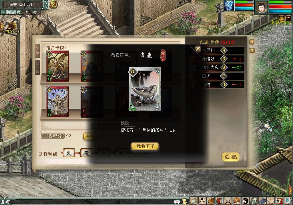 黑色的卡牌为未拥有的卡牌,彩色的卡牌为已拥有的卡牌。点击抽卡,可以使用灵兽积分抽取灵兽卡牌。若卡牌已拥有,则会返还部分灵兽积分。