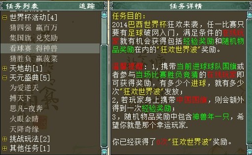 世界杯玩法第二波将于明天(6月12日)火爆开启啦!小伙伴们还不赶紧来看看这一波有什么新的玩法! 玩法一:在线看球就可赢神兽! 活动时间:2014年6月12日——7月14日 活动期间,任意比赛只要球队进球,就会发放“狂欢世界波”奖励。 凡在线玩家参与过本场比赛竞猜,国旗册中有进球球队国家的国旗且比赛有进球破网,就有可能获得神兽奖励! 玩法介绍: 1、“狂欢世界波”奖励何时发放? 2014巴西世界杯,64场比赛中的任意一场比赛,只要有足球入网破门,就会给满足条件的玩家发放奖励。 世界杯有多少粒进球,就有多少次"狂欢世界波“奖励。(最近五届世界杯平均每届进球数为150粒左右) 2、谁可以获得“狂欢世界波”奖励? 满足以下两个条件任何一个(或两个都满足)的玩家即可以获得奖励。 (a) 身上携带当前进球球队国家国旗的在线玩家 (b) 参与过本场比赛胜负竞猜的在线玩家 3、狂欢世界波”奖励包括哪些? “狂欢世界杯”奖励主要包括经验奖励和物品奖励。 (a) 经验奖励:100%获得(若身上同时携带中国国旗,则再额外获得一次经验奖励) (b) 物品奖励:随机获得(包括神兽年,龙涎丸宝宝,神兵,混元丹等各种贵重物品奖励) 活动玩法奖励(部分): 玩法二:猜世界杯胜负,赢海量菠菜 活动时间:2014年6月12日早8:00(维护后)——7月14日 玩法规则 2014巴西世界杯正鏖战在即,64球场将陪我们激情一下。参与每一场比赛的胜负竞猜,只要成功猜对赢家得主,就有机会赢取海量菠菜。“猜胜负”玩法的竞猜时间将从6月12日08:00:00(游戏维护后)持续到6月23日23:59:59.同时每天中午12点将在前一天参与“猜胜负”玩法的所有玩家抽中一名幸运玩家并赠送鎏金宝鉴分享版(赠品)一个。(只要参与竞猜,就有机会获得龙马) 玩法流程 比赛前24小时开始竞猜每一场比赛的胜负情况 比赛前半小时停止竞猜,玩家可在“我的竞猜”中查看历史竞猜数据 比赛结束半小时内根据对应球赛胜负计算竞猜结果 备注:活动时间内,玩家只要参与每一场比赛的胜负竞猜,成功猜对赢家得主,即可获得海量菠菜奖励! 同时在每天中午12点将在前一天参与“猜胜负”玩法的所有玩家中抽取一名幸运玩家赠送分享版鎏金宝鉴(赠品)一个! 持续使用菠菜竞猜,位列竞猜榜前百名,更有大奖相送! 玩法奖励(部分): 玩法三:猜世界杯四强,博百万大奖 活动时间:2014年6月12日——6月23日 玩法规则 参与“四强竞猜”玩法,就有机会成为百万富翁,游戏提供100万菠菜作为竞猜奖池的基础奖金,猜中四强国家两个以上(包含)两个)的玩家有资格参与四强竞猜奖金池的划分。 玩法流程 step 1 :玩家可选择任意数目球队国旗作为四强候选球队(最少为4枚,最多为10枚) step 2 :根据玩家选择国旗枚数,自动生成可能的四强候选组合,即生成玩家本次竞猜的基本注数 step 3 :玩家可以加倍投注,选择相应倍数,即得到玩家此次竞猜总注数(竞猜总注数=基本注数*倍数) step 4 :系统最终自动算出玩家本次竞猜总注数,玩家点击“确定竞猜”后会扣除所需的菠菜(所需菠菜数=竞猜总注数×10菠菜) step 5 :支持多次参与四强竞猜;可点击竞猜记录,查看四强竞猜数据 奖励规则 1 :玩家投注参与猜四强,每注需要10菠菜,具体投注用的菠菜要根军玩家选择的国家数和加注倍数来共同决定。 2 :猜四强起始奖金池为1,000,000菠菜。 3 :玩家可以多次下注,次数不限,其每次下注行为的历史数据都可以在界面上查看到。 4 :最后猜中四强国家两个以上(含2个)的玩家有资格参与猜四强奖金池的划分。 参与“四强竞猜”玩法,就有机会成为百万富翁!游戏将提供一百万菠菜作为竞猜奖池的基础奖金,猜中四强国家两个及以上的玩家有资格参与四强竞猜奖金池的划分! 活动众多,你还不赶紧参与进来?错过一次再等四年,快快拿起你手中的菠菜,随时等着变成神兽吧! <<<点击进入大话西游2论坛参与讨论>>>