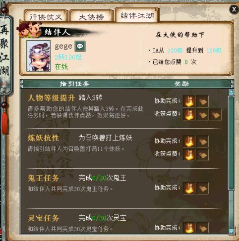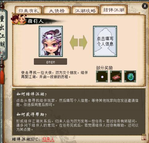 福利九,结伴江湖: 待你重出江湖,我在此与你再聚江湖。每位大侠可与一位回流玩家结伴再聚江湖。 结伴后双方共同闯荡江湖,若一方遇到困难,另外一方请尽量多多帮助。在回流玩家完成指定任务后,结伴双方都可获得归来人的奖赏。回流玩家还可为其点赞,点赞后另外一方奖赏更好。 回流玩家的结伴江湖界面: 1、点击填写个人信息 2、确认发布后即可等待大侠的邀请 当前玩家的结伴江湖界面: 1、点击寻找结伴人 2、从推荐回归玩家中寻找,可以加好友先沟通一下,待确认后邀请即可 3、等待回流玩家同意后,就可以恭喜你们完成结伴江湖。 完成结伴江湖关系后,归来人每天都会为双方发布一些任务,请双方共同协助完成。 任务完成时,回流玩家还可以选择是否为结伴人点赞。点赞后结伴人可获得更多奖赏。 <<<点击进入大话西游2论坛讨论>>> [编辑:韦小贝]