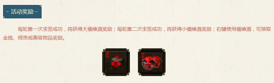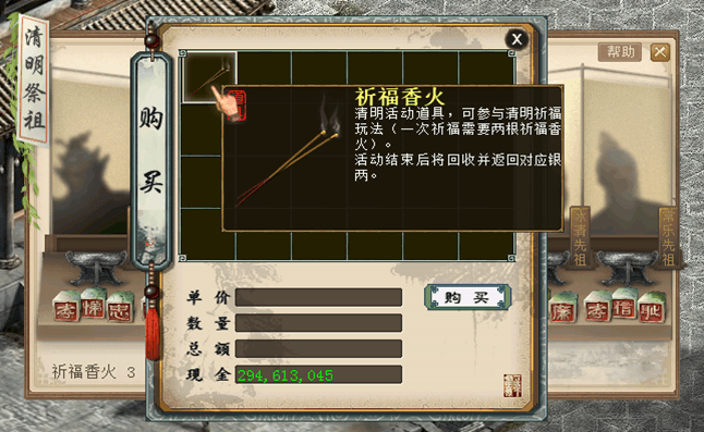 扫墓祭拜 单人活动简介: 一年清明之际,进入故人之墓,扫墓祭拜。 活动时间: 2019年4月5日00:00至4月7日23:59 参与条件: 等级大于等于30级,时间宠大于等于10级 活动流程通过洛阳城(87,170)公墓引导人,进入故人之墓场景。每3分钟可获得一次经验,每日可进行120轮。 清明祈福 单人活动简介: 清明期间,众人找到上香家丁向先祖祈福。有一位先祖准备了福飨酒赐予后生,看看能否给你带来好运。 活动时间: 2019年4月5日00:00至4月7日23:59 参与条件: 当日完成10次[鲤庭问德]玩法。 活动流程到长安城城隍庙附近找到上香家丁打开祈福界面。 购买祈福香火