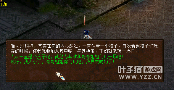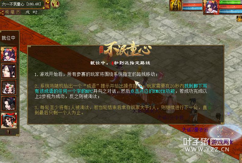 不泯童心 活动背景: 听说有童心的人永远都不会老呢,确认过你的眼神,你就是那个永远拥有童心的人!还记得小时候爱玩的抢凳子的游戏吗?不泯童心游戏将抢跑+猜成语结合,别有一番紧张刺激感!快去长安找爱玩的小孩,加入游戏吧! 活动时间: 2021年6月1日-6月2日每天18:00-24:00 活动对象: 角色等级≥50级,时间宠≥10级 活动介绍: 6月1日至6月2日每晚18:00至24:00符合条件的玩家可以找到爱玩的小孩(长安城313,180)报名参与玩法。凑齐5个人即可进行游戏。 这个玩法其实很简单,凑齐5个人后,大家会在系统的安排下在红色的路线上走动,系统会随机停止走动,大话精灵开始出题,大家需要猜出这个成语,并在20秒以内走到这个成语的任何一个NPC附近,点击该NPC,然后根据提示点击打坐或困觉功能。