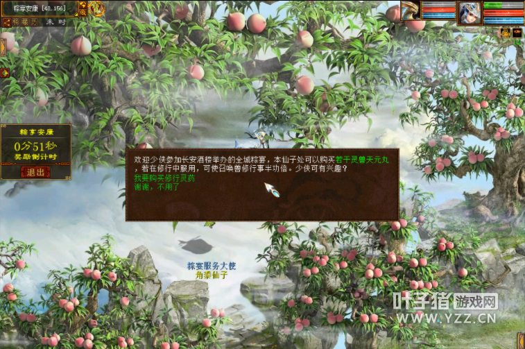 粽享安康·单人 活动流程 活动期间,各位侠士可通过“粽安康”进入“粽享安康”场景内参加宴会。 宴会每1分钟为一轮,每天可进行360轮。 各位少侠在粽享安康玩法中,可在角黍秘境内找寻角黍仙子购买灵兽天元丸,提升参战召唤兽的修行效率。