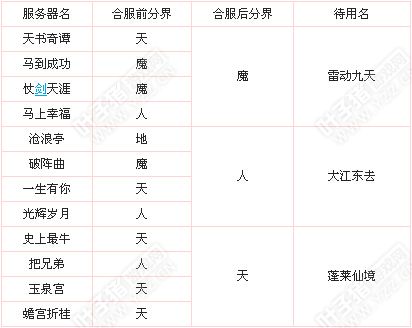 为了改善服务器的游戏环境,提高服务器人气,让玩家体验到更多互动和快乐,我们将在2014年12月4日开启2014年第4次合服! 为配合本次合并服务器,现根据合服工作需要及游戏实际情况,对废弃id进行清理。 >>推荐阅读:关于2014年第4次合并服务器清理废弃id说明 本次参与合并服务器名单如下: 合服后服务器名字说明:本次合服服务器名将由玩家投票产生,投票时间为11月27日维护后~12月1日中午12点期间,届时欢迎大家前往班宏(长安城215,133)处投票。 说明:受合并服务器数量,在线人数,合并原则等因素限制,对于本次没有合到的一些服务器,我们将在下次合服中予以考虑。 有时候合服分组以及最后是否合服会根据大家的要求进行相应的调整,最终合服结果以游戏实际为准。 特别说明: 1、本次合服后,本次合服相关服务器拥有免费改名机会的玩家需要在一个月之内完成改名,超过一个月则会失去免费改名的机会。 2、本次合服的投票要求:角色等级>=1转15级 3、本次合服投票需要大家先投票选择是否同意合服,选择同意合服的玩家可以继续投票选择合服服务器名。 根据服务器玩家的投票结果决定该服是否进行合服(合服支持率达到65%才会合服)。 如果某个服务器合服支持率没有达到要求,则不会进行合服,同时我们会取消该服务器的合服资格。合服分组内其他支持合服的服务器正常进行合服,服务器名由这些服务器的玩家投票决定。 |