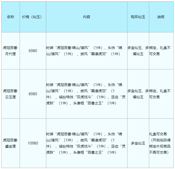 本周服务器已经进行全面维护了,大家一起来看看具体更新了哪些内容吧! PC版相关: 一、全服开放内容: 1.2022春节时装礼盒相关: 天门一长啸,万里百兽来!2022春节时装礼盒“虎冠百兽”将于1月20日19:30至1月27日08:00开启盛大售卖。 1)售卖期间,各位少侠可以在多宝阁“虎冠百兽”分页购买时装礼盒; 2)“虎冠百兽”时装礼盒分为以下几种: a.可使用“多宝仙玉”、“多福仙玉”购买“虎冠百兽·月竹匣”及“虎冠百兽·云玉匣”; b.仅可使用“多宝仙玉”购买“虎冠百兽·鎏金匣”,该礼盒可交易(开启后获得绑定外观商品不再可交易)。 3)虎冠百兽每个版本礼盒均为全服限量,售完即止; 4)虎冠百兽礼盒售卖期间,缤纷特效“双虎戏斗”、足迹“灵虎跃”、头像框“百兽之王”同步上架多宝阁售卖,时装“虎冠百兽·啸山/猎风”、头饰“啸山/猎风” 、披风“霜凛虎羽”仅可通过购买礼盒获得; 5)同时装扮整套虎冠百兽外观(时装、头饰、披风、缤纷特效、足迹以及头像框),即可获得全装扮功绩“虎冠百兽”(20点);2月10日19:30~19:40期间在线,即可参加珍稀穷奇手办、年手办抽奖活动。 2.2022年新春鸿运礼盒相关: 鸿运礼盒送鸿运,寅虎逐欢万物新。2022年新春鸿运礼盒将于1月25日0:00-2月8日23:59期间开启售卖。 1)活动期间,少侠可通过多宝阁综合类商品分页购买鸿运礼盒,购买后将获得鸿运宝珠;同时也可通过任务栏道具“鸿运宝珠”开启界面购买(PC及口袋版均支持);