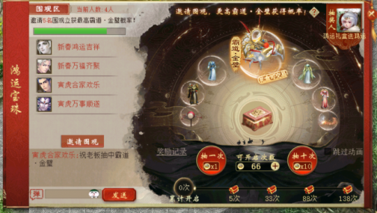2)开启新春鸿运宝珠时可以邀请其他玩家围观,邀请五人以上围观即可最大限度提升抽取寅虎福运宝盒的概率(宝盒可交易,开启后获得珍稀单人座驾霸道·金璧),同时被邀请围观的玩家也有机会获得围观奖励;