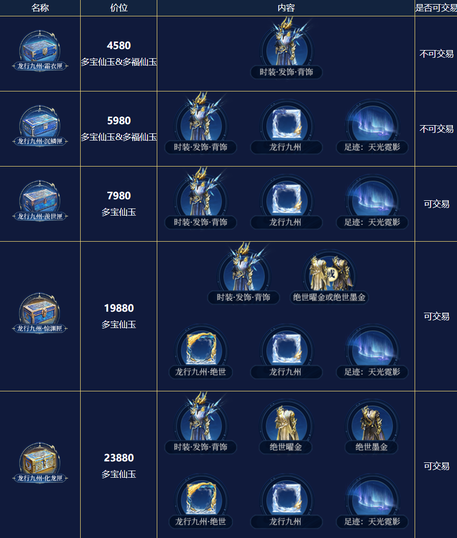 兄弟们好,本周维护时间又到了,来看看有哪些全新内容和大家见面吧! PC版相关 一、全服开放内容: 1.2024春节前置活动相关: 龙年到来之际,龙神庆将在长安开启,九州天下龙的传人,纷纷前往长安欢庆龙年,共度佳节。前来参加节会的百姓人数众多,路途遥远,恐有所闪失,长安人手不足,县尉特请少侠前去协助,确保前来共庆佳节的子民安全无虞。本周维护之后,2024春节前置-龙腾九州新岁至将在全服放出。 活动时间:2月1日10:00-2月6日23:59 2.2024新春签到活动相关: 2024新春签到活动将于2月1日开启!累计签到1、4、10、17、24天就有机会获得珍稀神兽年、鸡驴手办全系列、铜师傅大圣铜像等丰厚奖励!各位少侠千万不要错过哦! 活动时间:2月1日8:00-2月25日23:59 3.2024龙年贺岁锦绣系列: 1)应龙破渊冲天起,万象归一铸鳞机。2024龙年贺岁锦绣-龙行九州将于2024年2月1日(本周四)维护后-2024年2月25日23:59期间开售。龙年贺岁首次增加了绝世曜金和绝世墨金两款绝世锦绣供少侠选择。 a)此次售卖包括“龙行九州·霜衣匣”、“龙行九州·沉鳞匣”、“龙行九州·羡世匣”、“龙行九州·惊渊匣”和“龙行九州·化龙匣”5款礼盒,其中惊渊匣及化龙匣包含绝世款锦绣。 b)当全队5人均穿着绝世款锦绣时,将有概率在触发特殊入场动效“龙行九州·天机乍现”,少侠会是那个应龙钦选之人么? 温馨提示:入队效果在800×600以上分辨率的客户端显示效果最佳 c)“龙行九州·霜衣匣”、“龙行九州·沉鳞匣”、“龙行九州·羡世匣”、“龙行九州·惊渊匣”和“龙行九州·化龙匣”包含的道具详情及售价如下。 d)活动期间开放礼盒升级功能,玩家可通过补充指定数量仙玉的方式获得更高级礼盒的外观(注意:补充差价花费的仙玉总量可能会大于直接购买,请少侠谨慎选择) 2)龙行九州探天机,日月山河万象新。新春特别祈运活动“探鳞祈运”将于2024年2月1日(本周四)维护后-2024年2月25日23:59期间开启。 a)完成前置预热任务金鳞初探的少侠将会在维护后获得祈运道具应心鳞; b)玩家可通过消耗应心鳞参与祈运活动,每次祈运将有概率获得探鳞祈运限定座驾龙吟山河、限定缤纷特效冰心幻龙,并有概率额外获得周大福传承系列龙形足金饰品、鎏金宝鉴兑换券、画中仙典藏雕塑等豪华奖励! 温馨提示:龙吟山河为大话三界首款随世界昼夜变化而变幻形态的神奇座驾。 座驾<龙吟山河>预览 缤纷特效<冰心幻龙>预览 c)随着祈运次数增加,获得限定祈运外观的几率也会增加,其中999次祈运必得冰心幻龙,1998次祈运必得座驾。累计祈运到达1、18、88、188、388、688、1288将可获得祈运道具应心鳞、特殊节日功绩、限定冒泡框龙行沧波等奖励。 d)探鳞祈运特惠礼包开售!玩家可前往探鳞祈运界面左下角的祈运特惠处购买应心鳞·初礼及应心鳞·惠礼,折扣低至6.7折。另外,金银宝额外挑选了幸运的少侠,可能会获得金银宝额外的优惠赠礼,被选中的少侠可不要错过哦! e)2月1日-2月4日每晚8点起,少侠可前往探鳞祈运活动界面自行开启天降鸿运红包雨活动。在倒计时结束前开启鸿运锦囊,即有概率获得神兵、应心鳞等奖励。 f)拥有龙行九州系列外观(时装、头饰、披风、足迹、座驾、特效)即可获得对应单件功绩奖励,同时装扮还可以获得全装扮功绩“龙行九州”。 除此之外,在活动期间(2月1日维护后-2月29日23:59),完成龙行九州图鉴收集(时装、头饰、背饰、足迹、座驾、缤纷特效)的少侠可在龙年贺岁图鉴处领取“龙行九州“限定称谓,若收集时装为绝世款,将有额外的金色限定称谓赠送。 4.多宝阁相关: 1)春日特惠临门开,福泽新年送吉来。本周维护之后,多宝阁将为各位少侠提高装扮栏可存放的时装数量上限。 2)2024年2月4日8时-2月18日23:59,新春多宝阁将开启促销活动。少侠可享受六档累计满减(最高可减1500仙玉)!同时多宝阁将上架龙年春节系列道具装饰品“龙舞长安”、头像框“鱼龙夜游”、队标“生肖·龙”三款新品,新品特惠8.8折,可与满减优惠叠加! “龙舞长安”装饰品为首款拥有组队效果的装饰品,当全队成员(队伍不少于3人)均佩戴该装饰品时,将会触发舞龙表演!少侠快与好友一同闪亮长安的夜晚吧。 队标<生肖·龙>预览 5.好运充值相关: 本周维护之后,春节好运充值送好礼活动开启,一级神兵、终极技能修炼丹、画中仙雕塑、可动主角模型、贰拾周年游戏设定集等好礼等你来拿! 活动时间:2月1日08:00-2月15日23:59 6.排行榜相关: 迎新年,喜焕新!为优化广大玩家的体验,排行榜将推出全新界面、全新榜单,更支持上榜少侠分享个人实力!此内容将在全服放出。 1)全新界面:以国风经典“水墨”、重新誊录大话“天下风云人物”,明亮雅致、不失简约! 2)全新榜单:三界代有才人出,经慈恩寺方丈等前辈力荐,新增誊录“雁塔除妖榜”、“穷奇真身榜”,以载录英雄实力! 3)新分享功能:荣耀加身而人不知,如衣锦夜行。支持上榜少侠便捷分享个人实力,与兄弟分享自己或队伍的进步! 4)新荣耀展台:部分榜单将新增“展台”,以彰显群雄之首的英姿(根据榜单不同,榜首包含前3名或前5名)。 5)新个人页:支持查看所有上榜少侠的详细信息,点击玩家昵称即可打开个人页。 6)其他说明:长期未在三界活动(未登录)的少侠,名声渐渐沉寂,榜单将无法记录完整信息。 7)预告说明:其他全新榜单正在誊录中,也期待少侠的推荐! 7.战斗体验