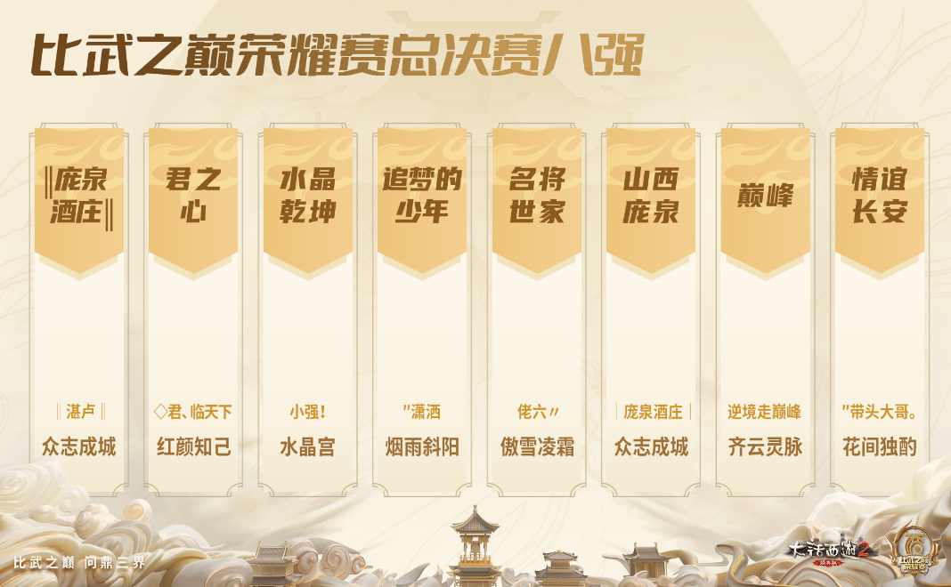 亲爱的玩家,大家好!!又到了每周的维护预览时间! 以下是本周维护内容: 1.赤子之心百炼成金,谦谦君子温润如玉!2024年大话西游2“比武之巅荣耀赛”线上赛阶段已正式落下帷幕,恭喜如下八支战队经历重重考验,最终会师河南洛阳,决战比武之巅!