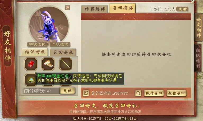 又到了每周例行维护时间,看下本周的精彩内容有哪些? PC版相关: 一、全服开放内容: 1.老友重逢回流活动相关: 岁月如歌,友谊长存。春节后老友重逢回流活动将正式开启,活动时间为2月20日维护后-3月13日维护前: 1)回归老友福利: a)承包365天点卡:你若回归随便玩!我们将为回流少侠准备365天点卡(等价5256现金红包)、2024鎏金宝鉴典藏版/珍爱版/分享版、鎏金宝鉴龙马激活卡等好礼; b)回流装备再升级:在之前基础上再次提升了回流装备的数值强度,为少侠带来更好回归体验; c)在线30分领红包:回归后只要单日在线30分钟即可前往微信召回活动小程序中领取一个6元~2025元红包,数量有限先到先得; d)回流专属召唤兽:只要300点活跃度即可领取回流专属小浪淘沙,还可进化为浪淘小沙; e)回流特权:包含大神装备攻略、组队福利、专属酒店、称谓特权、帮贡加成等12项回流特权; f)回流秘境:回流活跃度达到600点即可带队挑战回流秘境,有概率获得888现金红包、2024鎏金宝鉴典藏版/珍爱版/分享版、一级神兵等好礼。 2)召回老友介绍: a)召回老友:完成召回任务即可前往微信召回活动小程序中领取3~888元现金红包(数量有限先到先得),还有概率获得888现金红包、一级神兵等好礼; b)与友同行:与回流老友游戏内结伴,老友完成任务每获得1点回流活跃度可增加1点召回积分,使用召回积分有概率兑换888现金红包、一级神兵等好礼; c)组队福利:与回归老友组队,可享受帮战、降妖除魔、修罗、天梯比武、年年今朝等任务奖励加成;与回流活跃度达到600的老友(必须作为队长)挑战回流秘境,有概率获得888现金红包、2024鎏金宝鉴典藏版/珍爱版/分享版、一级神兵等好礼。 3)本周维护之后,参与老友重逢回流活动中的回流秘境专属副本、回流活跃度、召回老友、兑换心意好礼等玩法可获得通灵宝券奖励道具。使用道具后将开启宝库寻兽玩法,根据召唤出的守卫召唤兽种类可能获得数量不等的金钱、“我和五常神兽有个约会”和“我和珍稀神兽有个约会”功绩奖励。 2.年年今朝活动相关: 本周维护之后,年年今朝活动将在全服放出体验。年年有今日,岁岁有今朝,各位少侠可从时空之门穿越回梦想之初再续前缘,在其中体验老版全屏法术特效和主角造型,经典地图长安城东、龙窟凤巢、五指山、大唐边境等,还有练功区Boss和新九生九死挑战。 活动时间:2月20日10:00-3月16日23:59 3.城东魅影活动相关: 本周维护之后,经典活动-城东魅影再次开启,本次活动需回到过往,可施展旧版全屏法术,在木魅造杀孽之前,将其彻底剿除,恢复长安城东的安宁。少侠还有机会得到六艺神兽的欣赏,携其一起杀敌。 活动时间:2月25日和26日的10:00-23:59 4.大话精灵相关: 本周维护之后,将对大话精灵进行以下调整: 1)新增了热门搜索和搜索历史功能,点击文字输入栏会显示热门及历史搜索信息,同时输入内容后还会显示联想内容。 2)新增了“视频”页签,提供丰富精彩的游戏相关视频内容。 5.贺岁锦绣相关: 乙巳年贺岁锦绣<瑶光熹昭>应山海之春光曜现世,包括瑶光熹昭·仲春匣、瑶光熹昭·桃月匣、瑶光熹昭·芳菲匣、瑶光熹昭·天端匣、瑶光熹昭·瑶光匣5款礼盒。 新春特别祈运活动随少侠点亮明光格进度附赠限定缤纷特效灵鹿东来,限定座驾云鹿拂晓。集齐全套贺岁锦绣外观将额外赠送“瑶光熹昭“限定称谓,若收集时装为绝世款,将有额外的绝世款限定称谓赠送。 贺岁福利团及助力活动发放包含华为MatePro平板电脑、华为智能耳机、现金红包、九色焰、多彩仙玉等豪礼,在活动结束前集齐8人福利团的少侠即可参与2月22日20:00的在线抽奖,有机会赢取华为Mate70Pro大奖! <瑶光熹昭>贺岁锦绣售卖即将于2月21日23:59结束,届时贺岁福利团及助力活动也将告一段落。少侠切莫错过哦! 更多详情请查看<瑶光熹昭>贺岁锦绣专题: 6.其他内容相关: 1)本周维护之后,申请“删除角色”后的二次确认操作时间范围由“7天后”调整为“7至30天”,过期后需要重新申请。 二、局部测试相关: 1.本周维护之后,将在局部服务器放出客户端语音沟通功能,少侠可通过队伍频道开启语音功能,同时也可使用口袋版仙境进入语音沟通房间。 测试服务器:一生一世、白衣胜雪 2.本周维护之后,经典活动-天降灵猴将和大家重新见面,聪明调皮的灵猴重现人间,再次从天而降,少侠一起找灵猴要见面礼吧!与灵猴一同降临的还有五常神兽,期待有缘人与其见面!此内容将在局部服务器放出测试。 局部测试时间:2月20日10:00-23:59 温馨提示:局部测试期间不会获得神兽和步步高升玩法的奖励。 服务器:水晶宫、百鸟朝凤、傲雪凌霜 3.本周维护之后,战斗结束后携带的召唤兽都将会变更为:进入战斗前携带的召唤兽,同时取消了“锁定首发召唤兽”的设置项。召唤兽获得的经验(未使用枯荣丹的情况下)、技能领悟、部分玩法奖励(如版载千秋的经文奖励)的亲密值等也都会给到首发的召唤兽。此内容将在局部服务器放出测试。 测试服务器:一生一世、白衣胜雪 4.本周维护之后,猕猴桃将允许每格叠加到9个。此内容将在局部服务器放出测试。 测试服务器:踏碎凌霄、龙吟九州 三、天下第一比武大会: 天下英雄出我辈,一入江湖岁月催,皇图霸业谈笑间,不胜人生一场醉!第138届天下第一比武大会将于2月19日(周三)19:00开始各服务器的内部选拔赛。2月20-21日进行拷号确认,2