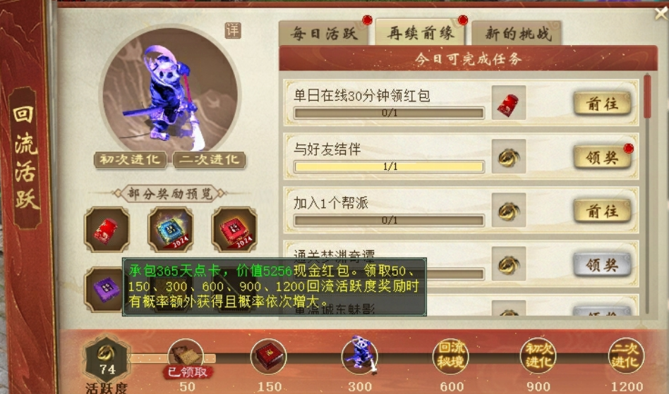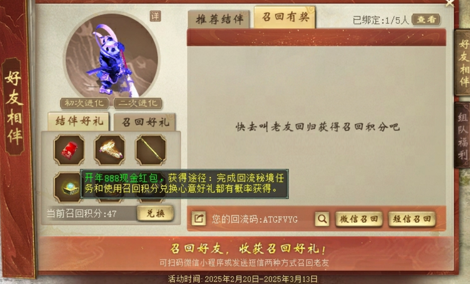 2)召回老友介绍: a)召回老友:完成召回任务即可前往微信召回活动小程序中领取3~888元现金红包(数量有限先到先得),还有概率获得888现金红包、一级神兵等好礼; b)与友同行:与回流老友游戏内结伴,老友完成任务每获得1点回流活跃度可增加1点召回积分,使用召回积分有概率兑换888现金红包、一级神兵等好礼; c)组队福利:与回归老友组队,可享受帮战、降妖除魔、修罗、天梯比武、年年今朝等任务奖励加成;与回流活跃度达到600的老友(必须作为队长)挑战回流秘境,有概率获得888现金红包、2024鎏金宝鉴典藏版/珍爱版/分享版、一级神兵等好礼。