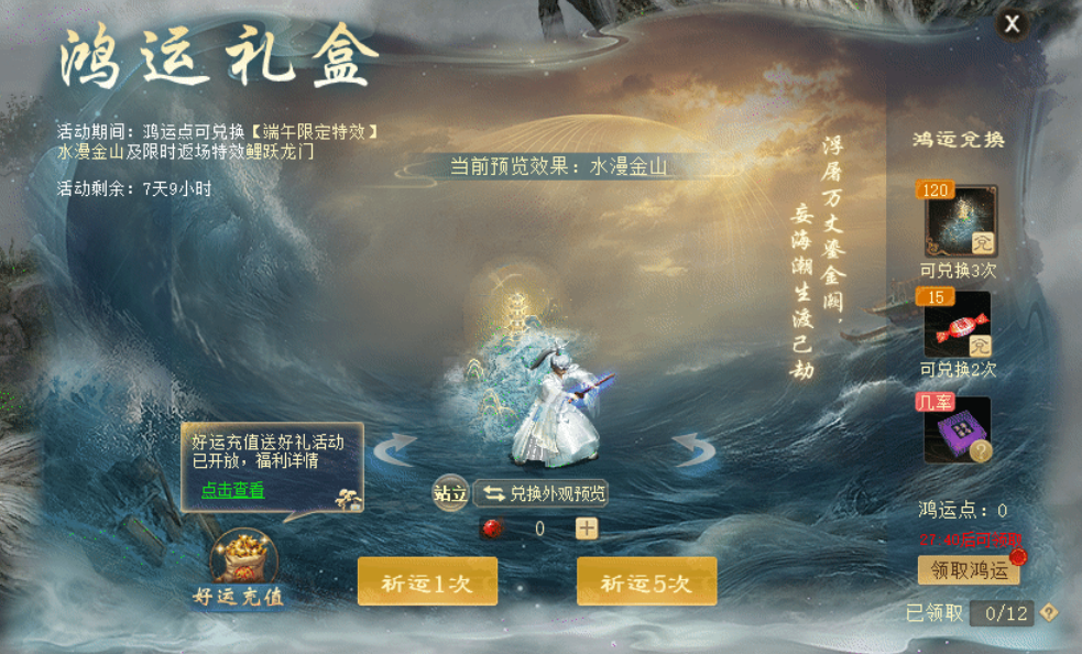 4.多宝阁相关: 青梅竹马,共话少年好时光 1)童趣时光机将于5月29日维护后开启,邀请少侠同温青梅竹马少年时。届时将有"竹月话""青梅语"主题时装、"竹马摇摇"趣味座驾、"戏竹"及"扑萤"萌趣童装等外观上新,并有"小幸运""快乐鸭"等个性面饰同步上线!初夏暖风,年少重逢。 2)感念好时光,共话少年时!5月29日维护后-6月15日23:59期间,童趣时光机活动推出特惠折扣,各位少侠可以优惠价格购买组合主题外观礼包,组合购买折扣低至3.5折! 注意:活动结束后该主题外观将恢复原价,且特惠折扣全场仅限购买1次。感兴趣的少侠切勿错过哦! 3)童趣升级!5月29日维护后-6月5日23:59,人气童装限时回归,全场童装9折特惠。 5.鸿运祈福活动相关: 浮屠万丈鎏金阙,妄海潮生渡己劫。5月29日维护后-6月5日23:59,鸿运祈运活动将限时开启,本期可用鸿运点兑换端午限定缤纷特效“水漫金山”!另有限定缤纷特效“鲤跃龙门”限时返场! 每日积累在线时长达到半小时则可以领取鸿运点哦!