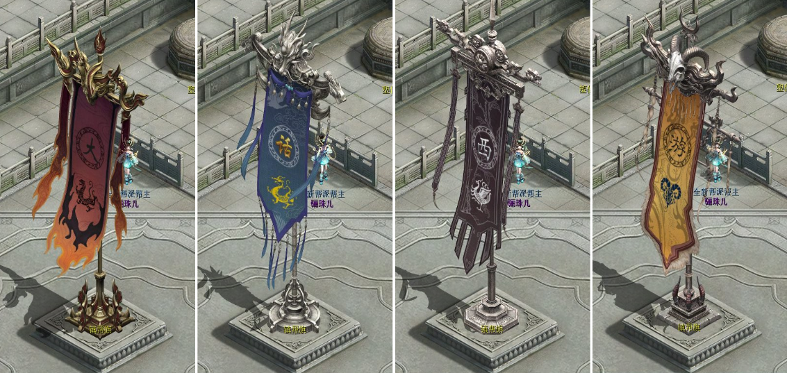 <帮旗DIY>效果预览 d)守护神再临,福泽帮派。全新守护神幻化功能推出,参与侠骨墟寻宝有机会获得守护神精魄,帮派集齐一定数量精魄可对帮派守护神进行幻化。