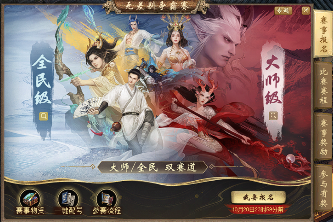 4.无差别争霸赛相关: 1)全民上场,一决高下。2025年无差别争霸赛报名将于10月2日10:00正式开启,10月20日24:00截止。9月25日维护后直至报名时,角色在线时间≥30小时即可报名。 2)本届无差别继续开启全民级和大师级双赛道,玩家在本服报名后,前往比赛服组队再选择赛道。全民级赛道只能5名正式人员参赛,高排名还能获得大量赛事积分。而大师级赛道可选5名正式+2名替补人员参赛,其赛道拥有高额的排名奖励,除了四阶仙器、一级神兵藕丝步云履、啸月珍爱版鎏金宝盒,冠军队伍更能直接获得25万现金奖励!无论参与全民级还是大师级,只需要参与第一轮小组赛就能一起瓜分合计25万的海量现金红包!赛事获得的积分更可兑换大话畅游行李箱、浪淘沙毛绒公仔、鸡驴车载套装等丰富周边奖励,数量有限,换完即止!也可以使用积分有机会抽取大话实木机械键盘、五常鎏金酒具礼盒、珍稀年手办、大话好运麻将等贵重周边奖励!