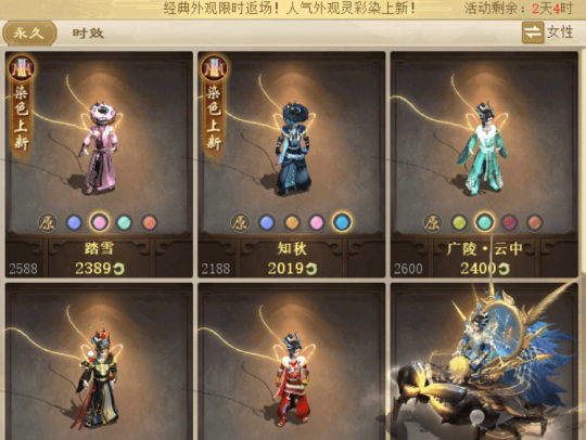 3)经典外观限时返场![广陵·云中]、[锦瑟·华年]等经典外观限时返场多宝阁,喜爱的少侠切莫错过~ 4)多宝染坊上新!人气外观[踏雪]、[寻梅]、[知秋]、[婵娟]现推出多款灵彩染方案,拥有的少侠可使用[虹鱼儿]为您的外观焕染新彩~