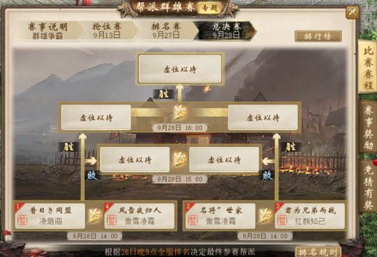 3.帮派群雄季后赛相关: 第14季跨服帮战-帮派群雄季后赛已经开打,诚邀全服实力名列前茅的帮派共聚一堂,为兄弟、为荣耀全力一战!赛后,全服前100名帮派根据跨服帮战排名,均可获得丰厚奖励,同时最终排名也将为第15赛季跨服帮战赢得先机!期间全民还能参与四强竞猜和冠军竞猜,一级藕丝步云履、二阶仙器等诸多好礼等着你们来拿! 本届赛事前32名帮派还额外获得帮派时效外观奖励,通过消耗不同的观赏币即可获得30天帮派建筑外观效果。 活动时间:9月8日-10月5日,现已开启冠军竞猜。 比赛进程: 排名赛:9月27日20:00; 四强赛:9月28日14:00。
