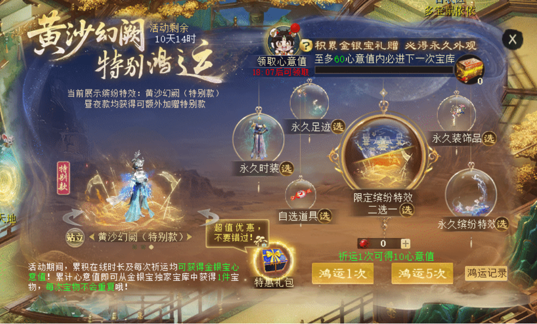 时装<君之心>效果预览 6.多宝阁相关: 本周维护后至2025年10月8日23:59,多宝阁十一促销活动限时开启! 1)全场外观多件折扣!活动期间购买人物及召唤兽外观,可享1件9折、2件8.8折、3件8.5折。座驾技能书及虹鱼儿·彩匣等道具亦可参与多件折扣活动。 2)黄沙幻阙特别鸿运限时开启!参与祈运可获得金银宝的心意值,少侠可在各品类宝库中自选心仪的永久外观,集满心意值即可获得选定奖励之一。集齐限定缤纷特效[日笼沙]、[月映楼],还可获赠特别版限定典藏缤纷特效[黄沙幻阙]。