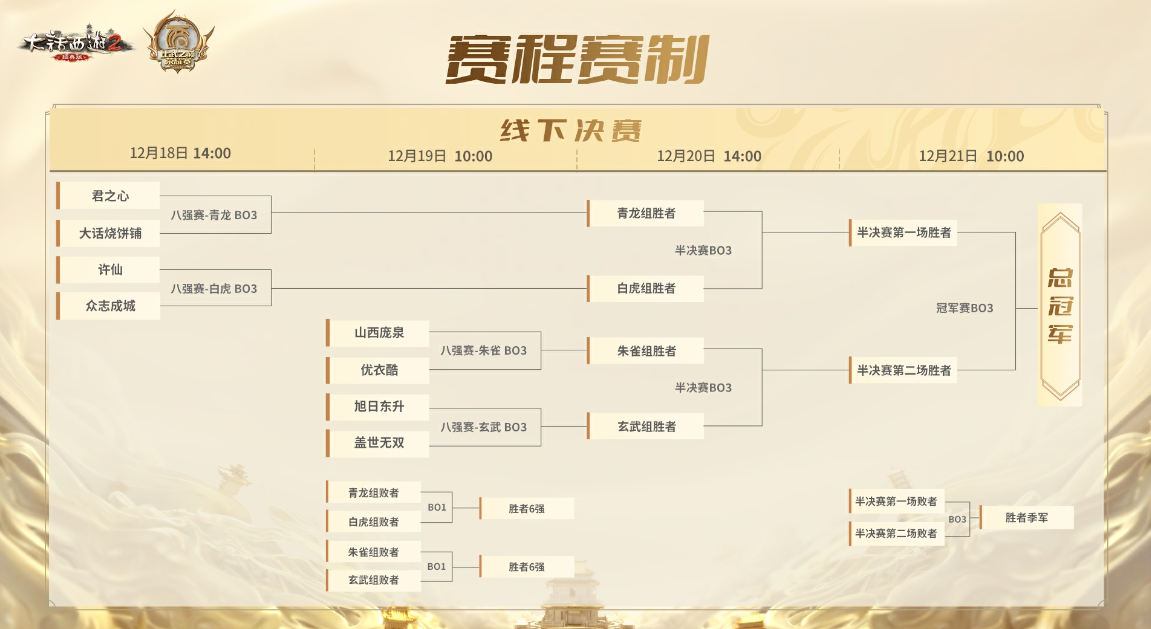 比武之巅,问鼎三界!12月18日-21日,上海长三角国际电竞文化中心诚邀各路豪杰共赴盛会,欣赏比武巅峰对决! 比武之巅荣耀赛系列周边玩法火热开启中: 1)荣耀竞猜-线下预测:参与日常玩法获得比武荣耀令,使用比武荣耀令预测最终四强排名与每场战斗比分,既有机会瓜分全服奖池,赢海量竞猜积分,兑换2025鎏金宝鉴、大话好运麻将、大话实木机械键盘、画中仙珍藏级雕塑等精美好礼!本周维护之后,四强排名预测将新增撤回功能,撤回后返还当前所选组合全部比武荣耀令,少侠可根据抽签对阵结果,在周四14:00第一场比赛开始前重新预测四强排名。 2)荣耀战队空间:线下8强队伍将开启专属战队空间,使用震天鼓助威战队成为粉丝,即可在战队空间内与支持的战队互动合影,最终冠军战队助威榜前200少侠可获得专属冠军福袋赠礼!决赛结束后,冠军战队也将在比赛现场抽取一名粉丝送出随机六艺神兽一只! 3)冠军红包赠礼:年度总决赛结束后,冠军战队队长将获得冠军红包道具,使用后可在本服发送海量世界红包,与服同庆夺冠之喜! 4)冠军花车巡游:冠军战队所属服务器将在12月22日晚18:30开启冠军花车巡游,届时冠军成员战队将登上荣耀花车,巡游长安!跟随花车参与巡游并送上贺词,有机会赢取专属冠军赠礼与冠军红包! 2.主界面相关: 本周维护之后,将迭代主界面上方的布局: 1)调整左上方入口的布局,扩大世界地图和当前地图的按钮,删除微博分享的入口,如需要分享可通过系统-精彩分享来实现。 2)战斗中召唤兽头像及其相关功能将迁移到右侧,左侧新增排行榜、藏宝阁、多宝阁、精彩比赛等入口。 3)战斗中左上角新增开关操作信息辅助的功能。 4)优化战斗中双方状态(记)所展示的数据。 5)战斗到达回合上限前3回合增加提醒。 6)优化了口袋端相关布局。 7)帮战挑战增加展示双方状态(记)。 3.名望任务相关: 本周维护之后,将对名望任务进行如下调整: 1)修复名望任务中角色死亡时战斗失败的问题。 2)调整人族、龙族任务中同族助战角色的速度属性。 3)名望总值达到3500后将可以进行任务定向,大幅提高定向种族任务出现的概率。 4.其他内容相关: 1)本周维护之后,使用疾风迅雷天赋技能击杀召唤兽使其触发卷土重生后,会重新挑选所有符合条件的目标来进行后续攻击。 2)本周维护之后,PC在窗口模式下增加小窗模式功能,通过右上角新按钮进行开启。 3)本周维护之后,赤脚仙任务改为新服开放30天后开放;同时参与等级要求改为0转30级至1转122级。 二、局部测试相关: 1.瑞雪本应兆丰年,今朝却化不祥之兆。近日三界各处生灵异动,巫云已亲至长安,向各路豪杰求援! 本周维护之后,冬雪启元活动将在局部服务器放出测试。 活动时间:12月18日10:00-12月19日23:59 测试服务器:百鸟朝凤、水晶宫、万里长城 2.本周维护之后,将增加变身卡切换功能,少侠可以同时使用2张不同变身卡,并进行切换。此功能将在局部服务器放出测试: 1)2张变身卡的剩余时间单独计算,同步减少。 2)可在变身卡集的“当前生效”栏中进行切换,或点击右上角状态栏的卡片图标进行切换。切换时需要支付25000银两。 3)已使用2张卡片时,使用不同的变身卡,会替换掉当前激活的变身卡。 4)仍可以通过使用相同的变身卡来延长持续时间。 测试服务器:百鸟朝凤、水晶宫、万里长城 3.本周维护之后,称谓系统将进行焕新迭代。此功能将在局部服务器放出测试: 1)称谓界面焕新升级!在新版称谓界面中,少侠可在内按类别或搜索功能快速查找称谓,并预览查看称谓的具体展示效果; 2)称谓展示场景全面拓展!佩戴称谓后,组队界面、玩家信息界面、好友聊天界面等众多社交界面,均新增称谓的展示空间; 3)对部分称谓的展示效果进行升级优化,其中2025年比武之巅冠亚季殿军的称谓将会提前进行焕新迭代! 测试服务器:盛世山河 4.本周维护之后,将会对小鬼、天庭、鬼王、修罗任务进行以下调整。此功能将在局部服务器放出测试: 1)次数共享: 每天参与小鬼、天庭、鬼王、修罗任务奖励次数共享,一共90次,完成90次后获取的经验将会大幅降低;其中每日前30次击败修罗时,如果仍有任务奖励次数,则会额外消耗2次经验奖励次数并获得2点混沌之气; 2)参与条件调整: 小鬼任务参与条件修改为0转40级~0转89级,通关3称谓剧情; 天庭任务参与条件修改为0转70级~0转102级,1转62级~1转122级,通关6称谓剧情; 鬼王任务参与条件修改为≥1转90级,且通关8称谓剧情; 修罗任务参与条件修改为≥2转82级。 3)新服开服90天内,领取鬼王任务中不会再遇到特殊鬼王以及鬼帝; 4)新服开服90天内,当天完成30次鬼王任务后可以前往白骨山挑战五大特殊鬼王(主祸鬼王、主险鬼王、主疾鬼王、主命鬼王、主兽鬼王);当天完成60次鬼王任务后可以前往白骨山挑战鬼帝。 测试服务器:剑试天下、天涯侠踪 三、试玩先行相关: 1.本周维护之后,将对帮战奖励进行以下调整,此内容将在游戏试玩放出测试: 1)本周帮战结束后,下周发放“额外的宝象降魔五倍次数”奖励将调整为发放“帮战周本加成”状态(完成指定的周常副本时即可获得额外的经验奖励,可从“任务栏-周常副本”处查看); 2)帮战周本加成说明:甲/乙/丙/丁级及以下帮派每参与1场帮战即可获得8/6/5/4%的周本经验加成; 举例:本周参与3场甲级帮战则下周即可获得24%的周本经验加成; 3)每周可获得经验加成的周常副本