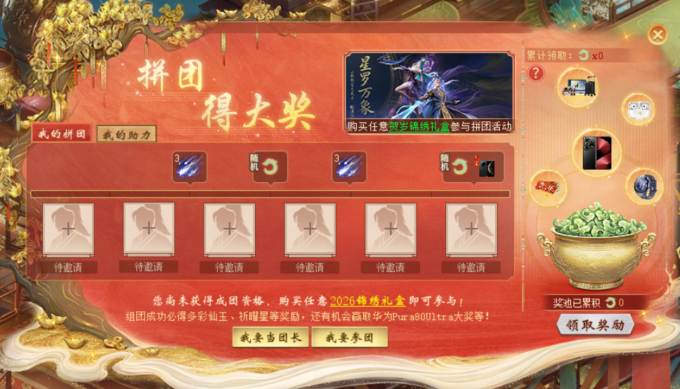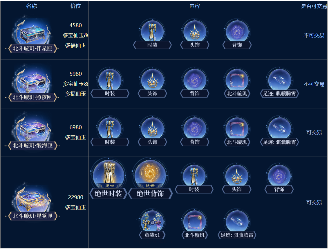 又到了每周例行维护时间,本周会有哪些精彩内容? PC版相关: 一、全服开放内容: 1.春节预热活动相关: 共筹大典祀天地,共养年猪帮派兴。巫云筹办祈年大典,遣巫雷送来年猪,委托帮派喂养。 本周维护之后,2026春节预热活动【共筹大典祀天地】将进行如下修改: 1)天材地宝活动时间,新增每日20:00,22:00两个时间段,少侠可以陪年猪游历三界,收集天材地宝进行喂养。 2)获取帮派新春改造后,将自动替换,少侠可以回帮查看新春妙趣。帮派新春改造将在2026年3月5日维护后回收。 3)喂养出色的年猪,将在2026春节活动期间,于长安东(73,27)持续展示。 2.春节贺岁锦绣相关: 丙午年贺岁锦绣<北斗璇玑>携全新武器幻肤<万象星踪>系列上新,星河祈运开启马年浪漫星光。 1)七星垂玉宇,骏影过云霄。丙午年贺岁锦绣<北斗璇玑>即将于2月5日(本周四)维护后-3月8日23:59期间开售,北极星辰万点流辉,霓影霞光照彻九垣! a)此次售卖包括“北斗璇玑·伴星匣”、“北斗璇玑·照夜匣”、“北斗璇玑·缎海匣”和“北斗璇玑·星筵匣”4款锦绣礼盒。其中缎海匣和星筵匣将在售卖活动结束后支持藏宝阁交易。 b)4款礼盒包含的道具详情及售价如下,少侠将根据开始礼盒时的性别获得对应性别的时装(发饰、衣服、背饰),发饰、服饰、背饰均可与其他外观搭配。其中,照夜匣额外附赠缤纷足迹:骐骥腾霄和头像框:北斗璇玑,星筵匣除上述内容外包含绝世锦绣及首次发布的绝世背饰供少侠珍藏,并提供一件自选童装(岁岁星或年年愿)。少侠穿戴绝世锦绣时不妨驻足片刻,即可触发挥手触星辰的专属待机动作 缎海匣与照夜匣内容物相同,并支持藏宝阁交易。 特别说明:点击下方小图即可放大查看对应外观。 c)活动期间开放礼盒升级功能,玩家可通过补充指定数量仙玉的方式获得更高级礼盒及对应外观。 d)每款礼盒首次购买时均可获赠等价玉心。 2)御剑破长空,云驹踏星来。贺岁特别星河祈运活动将于2月5日(本周四)维护后-3月8日23:59期间开启。 a)完成前置预热任务<岁岁星愿>的少侠将会在维护后获得贺岁祈运道具<祈曜星>; b)少侠可通过消耗祈曜星参与星河祈运活动,每次祈运将有概率获得星河系列外观,包括座驾七星巡猎、绝世座驾万剑归宸、缤纷特效白玉京、剑中仙、足迹星河涟漪、装饰品白驹流星等,御剑乘风辰宇熠熠,星河浪漫尽收眼底! 温馨提示: i)七星巡猎、万剑归宸均为陆空两用座驾且可触发特殊待机动作,星辰护航剑光闪亮。 ii)骑乘七星巡猎、万剑归宸座驾均可显示墨影铄金及万象星踪系列武器幻肤,星河于手,新岁无忧。 iii)穿戴北斗璇玑系列贺岁锦绣并骑乘七星巡猎、万剑归宸座驾时,座驾将散发专属光辉。 c)少侠每次祈运均可点亮一枚星星并有概率获赠限定外观、小糖果等奖励,若点亮星星为金色幸运星,该次祈运将转动星河轮盘并获赠轮盘内奖励!每次进入星河轮盘必得一件轮盘内宝物且限定星河系列外观不会重复。每300次祈运内必定点亮一枚金色幸运星。少侠初始解锁轮盘为星轮·初,随祈运进度将解锁星轮·复及星轮·极,获赠全部星轮奖励后将解锁玉心星轮 累计祈运到达1、18、88、188、388、888、1588将可获得祈运道具祈曜星、特殊节日功绩(最多可获得12点)、星垂天野限定冒泡框等奖励。 d)星河祈运特惠礼包开售!玩家可前往星河祈运界面左下角的超值祈运处购买北斗璇玑·初惠及北斗璇玑·特惠,折扣低至6折。另外,幸运的少侠可能会收到来自金银宝的特殊馈赠,少侠请不要错过哦! e)随少侠收集北斗璇玑及星河祈运进度可解锁限时图鉴奖励,包括称谓"北斗璇玑"、绝世称谓"星罗藏万剑·极宸"和限定头像框星罗万剑等 3)星月揽于怀,银河入刀锋!大话江湖首款星空主题武器幻肤<万象星踪>系列也将于2月5日维护后上线多宝阁,若少侠所携带的武器装备携带特技碧海青天、紫气贯虹及龙血玄黄,使用明光珀升级万象星踪系列幻肤至对应等级,则武器幻肤可显示出专属的光彩效果。 2月5日维护后-3月8日23:59,万象星踪系列武器幻肤特惠上新仅售2380仙玉(原价2680仙玉),将在活动结束后恢复原价。武器幻肤升级至对应造型的碧海、紫虹、玄黄等级分别需要消耗1、3、8个明光珀(明光珀单价1000仙玉)。 该系列幻肤可与七星巡猎、万剑归宸座驾搭配使用,首次获得万象星踪系列武器幻肤、首次升级该主题幻肤至碧海、虹紫、玄黄等级都将获得对应功绩,星月神话与少侠共写,银河浪漫尽入怀中。 3)贺岁福利,好运驾到! a)贺岁锦绣售卖期间(2月5日-3月8日),少侠可与其他购买贺岁锦绣的玩家组成贺岁福利团,组团人数达到2、3、4、6人将可解锁祈曜星、多彩仙玉(最高每次可返还999多彩仙玉)等豪礼,全团解锁奖励进度同步,好兄弟有福同享,马年幸运星就是你哦! 另外,集齐6人福利团的少侠还将每人享受1次成团大奖抽奖机会,中奖几率100%,华为WATCH5智能手表、华为无线耳机马年珍藏版、贺岁锦绣礼盒免单券等诸多豪礼等你来拿。3月9日20:00,我们还将在所有已集齐6人福利团的在线少侠中抽取幸运少侠送出华为 Pura80 Ultra大奖! b)兄弟助力,齐心协力!贺岁锦绣售卖期间(2月5日-3月8日),少侠可通过邀请及为他人助力在积累仙玉聚宝盆中的多彩仙玉额度,每次获得助力及助力成功100%增加可领取的多彩仙玉额度(至高可领取2000多彩仙玉),并可获得1次抽奖机会,有机会获得华为Pura80Ultra手机、华为WATCH5