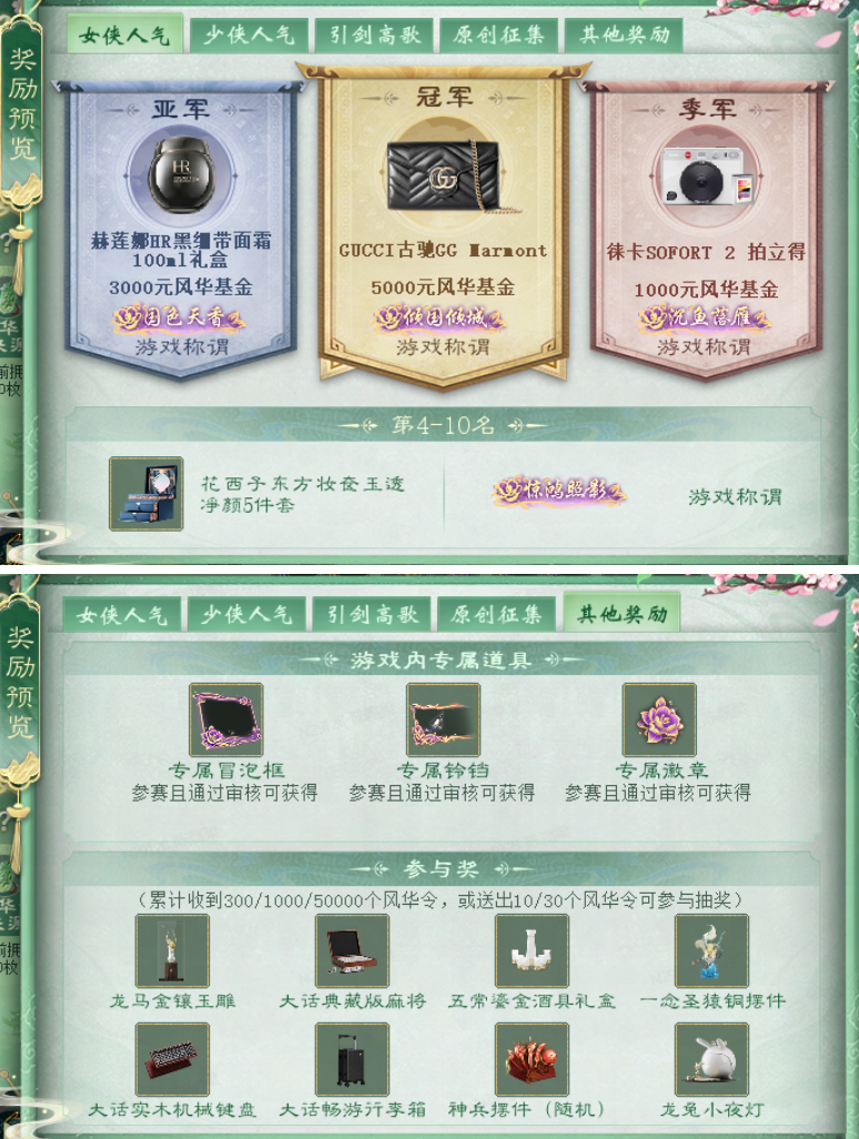 又到每周例行维护时间了,本周会有哪些精彩内容! PC版相关: 一、全服开放内容: 1.风华冠长安活动相关: 风华冠长安,才艺惊世人!大话风华冠长安-全民参与活动将于3月5日10点起开启投稿,3月9日10点起开启投票。活动简介: 1)报名参加 a)等级≥1转100级的少侠或女侠可点击左上角“风华冠长安”活动按钮或打开活动专题页面,请您务必仔细阅读参赛规则,按照指引上传参赛作品待工作人员验证通过后即可成为选手; b)成为参赛选手后可免费领取专属铃铛、时效冒泡框和徽章,累计获赠300/1000/50000枚有概率获龙马金镶玉雕、大话典藏版麻将、五常鎏金酒具礼盒、一念圣猿铜摆件、大话实木机械键盘、大话畅游行李箱等实物好礼; c)参赛选手名次奖励: