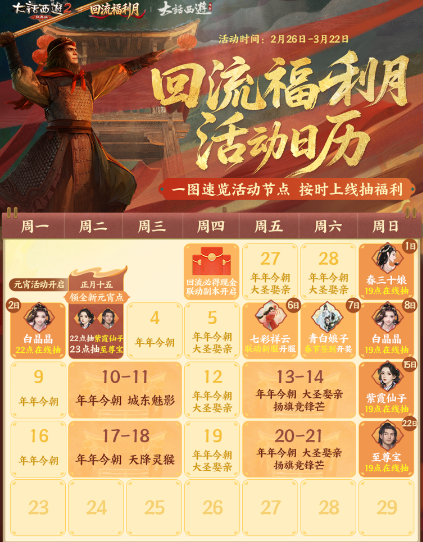 d)除获得其它少侠和女侠赠送风华令外,还可通过如下三种方式增加风华令数量; ①抖音分享:使用特定标签#大话西游2经典版、#2026风华冠长安上传真人拉票视频; ②亲子元素:参赛作品包含共同出镜的亲子组合; ③故事分享:参赛作品中分享自己与大话西游的故事或对大话西游的感受; ④个人社群:分享个人游戏微信群内拉票截图(微信号需该社群管理员,社群满足五十人以上) 温馨提示:抖音分享成功后请到官网活动专题页面中按照指引上传相关截图,验证通过后便可增加数量; 2)风华令支持: a)等级≥1转100级的少侠完成雁塔除妖第5层、孤竹城怨憎会苦关卡、定心除魔第15关、帮派大战、参与天梯比武任务可获得风华令; b)累计送出30枚风华令可获得时效称谓风华初见,累计送出10枚、30枚皆有机会获得龙马金镶玉雕、大话典藏版麻将、五常鎏金酒具礼盒、一念圣猿铜摆件、大话实木机械键盘、大话畅游行李箱等实物好礼; 活动介绍:https://xy2.163.com/news/20260302/38020_1288955.html 2.帮派群雄季后赛相关: 第15季跨服帮战-帮派群雄季后赛即将开打,诚邀全服实力名列前茅的帮派共聚一堂,为兄弟、为荣耀全力一战!全服实力排名前32的帮派可获得参赛资格,在这32个帮派中,如3月13日的周五帮战胜出,则自动参与赛事,通过季后赛的方式争夺最终冠军。赛后,全服前100名帮派根据跨服帮战排名,均可获得丰厚奖励,同时最终排名也将为第16赛季跨服帮战赢得先机!期间全民还能参与四强竞猜和冠军竞猜,一级藕丝步云履、二阶仙器等诸多好礼等着你们来拿! 本届赛事前32名帮派还额外获得帮派时效外观奖励,通过消耗不同的观赏币即可获得30天帮派建筑外观效果。 活动时间:3月9日-4月5日,3月9日开启四强竞猜。 比赛进程: 3月14日晚上8时抢位赛; 3月28日晚上8时排名赛; 3月29日下午2时四强赛。 3.回流月活动相关: 2026老友回流月-月光宝盒活动已正式上线,牛魔王虽然退败,可至尊宝永远失去了紫霞。如果再来一次,能否改写这个结局?大圣娶亲副本将在本周四到周日重新开放,隐藏结局“独战牛魔王”限时开启。 老友重逢回流活动正在进行中,百位主播直播带玩,答疑解惑,欢迎回流老友!