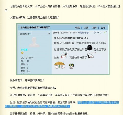 相关链接: 内容提要: 今年会出一只新的神兽,方向是敏系的,造型是拉风的,样子是大家曾经见过的。大家都在纷纷猜测,这神兽究竟会是什么造型呢? 很多朋友问,这神兽咋获得呢?今天,继续把得到的消息透漏给大家。 这只新的神兽,最近的一个获得途径是:今年国庆当天下午在线就送奖励的狂欢时刻投放! 当然,国庆的其他时间也是有其他神兽的,但国庆的活动中,只有10月1日当天下午狂欢时刻才投放这只神兽哦。(国庆之后的大型活动,新神兽也会有投放) 至于神兽的造型,初值,成长等,敬请大家关注! [编辑:星陨]