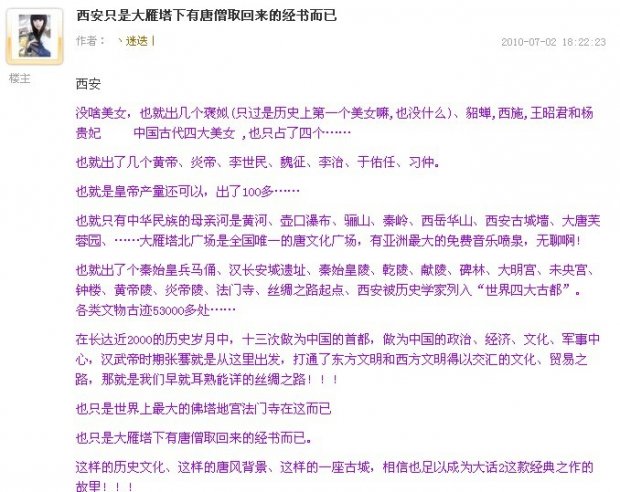 八大城市同台PK!谁将获得大话西游Ⅱ狂欢庆典举办权? 话说2010年《大话西游Ⅱ》“烽火连城”8·15狂欢庆典举办城市票选活动开展以来,得到了无数大话2玩家的高度关注,北京、天津、广州、深圳、郑州、太原、石家庄、西安这八座城市,谁最后将有荣幸承办这次庆典活动呢?目前投票开展已10天,让我们来对投票情况窥探一番吧! 截至7月12日15:20,最高票数的城市当数北京,已经得到23185票。接下来郑州、太原、西安都已经超过6000票,大家抓紧为自己喜欢的城市投票啊! 看看,大话2的玩家们正用尽浑身解数,来为自己所在或自己想去的城市加油拉票呢!擅长四格漫画的大话2玩家辰仲,就通过绘制漫画来为北京加油,为大话2和烽火连城加油呢。 而西安的玩家也不落后,马上发帖让大家一人说一个选择西安的理由。有玩家说大话Ⅱ的游戏场景都主要取材于西安(古时长安)的景点,譬如说大雁塔;有玩家说西安有大雁塔,那里是我们从一个彻头彻尾的游戏新手开始成长的地方,有玩家说西安有大唐芙蓉园,这是大话2新资料片里新长安最美的景色……西安就是长安,那里是300万大话2玩家居住的地方。更雷者发言说乾陵就在西安,那可是一代明君李世民的墓地...李世民在期待.期待看看烽火连城在西安开幕。 |