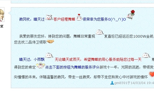 引子:事件很小,但是发人深省,值得讨论。当你觉得自己的正义没有得到伸张的时候,是安于沉默,还是敢于发声?这也许就直接影响了事件最终的处理结果。 >>推荐阅读:物华天宝温馨提示:请远离罪恶远离赃物! 正文:一位玩家向我爆料,一件小事,但是值得思考。事件的过程大概是这样的,这位玩家想要一个万籁俱寂的吉祥果,他有个朋友刚好有一个,于是就跟他换了。换了之后,他觉得自己刚换过来的新吉祥果抗性不好,于是用了7个盘古石重新打了抗性。刚打好抗性,却被系统通知这只召唤兽是被盗物品所以被追回,给了他8000W两。就算这只万籁吉祥果只值8000W,那他那7个盘古石的代价又由谁来赔偿呢? 于是,他开始了他漫长的申诉之路。第一次GM不搭理,第二次答应赔偿1000W,他依旧不满意。他连续申诉了7次,最终GM答应了把对应7个盘古石全部还给了他。 结语:我觉得从中我们有两点需要警惕。 第一:现在盗号物品的交易手法千奇百怪,以前低价出售只是一种,现在很多人开始用非等价交易的方法销赃,大家一定要留一个心眼。 第二:在游戏中遇到不公平待遇,一定不能沉默不出声,你越沉默GM越觉得你好欺负。只要你觉得你的正义没有得到伸张,你就应该像这位玩家一样不停的申诉,或者找到我们叶子猪记者将其爆料,让更多人关注,给GM压力。 <<<点击进入大话西游2论坛参与讨论>>> [编辑:猴战将]