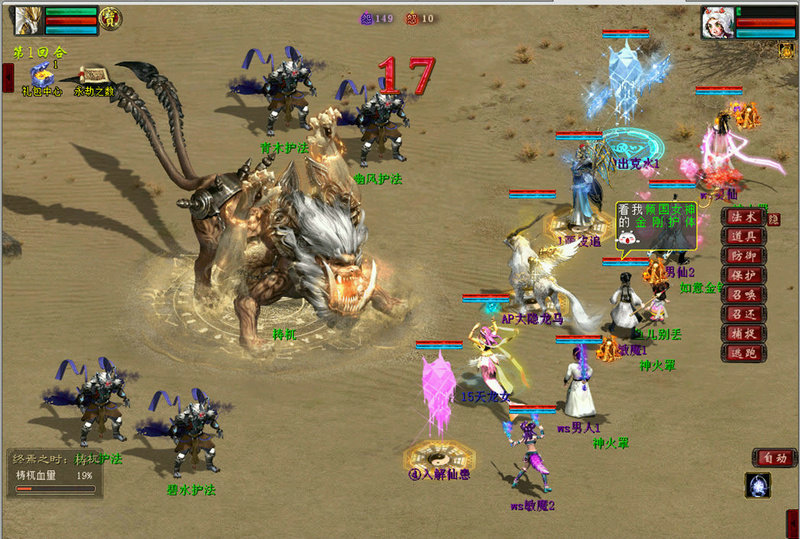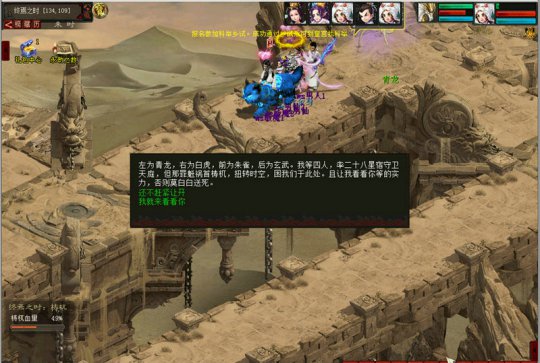 第四周: 本周通关条件:成功击败梼杌,将其血量减为零 一、单人剧情:轮回宿命 (一)任务目的 皇天不负有心人,梼杌的藏身之处已然找到,最后的死战,即将来临。 前往霸下处,继续使用时空之门,进行时空穿梭。 (二)任务步骤 1.与神秘人对话 与神秘人对话后,会观看一段剧情动画。 2.与霸下对话,传送到梼杌所在时空中 使用霸下背上的时空之门,进行时空穿梭。 来到梼杌所在时空,但不知它藏身何处,需好好寻找一番。(ALT+1小地图功能将无法使用) (三)任务提示 此任务可单人完成,也可组队完成 二、全服挑战:击败梼杌 (一)任务目的 众位侠士齐心协力,在这如迷宫的终焉之时中,找到梼杌藏身之处,并进入战斗。 梼杌甚是狡猾,当其战力不支时,会扭转时空,会重置场景,一切需从头再来。 (二)任务步骤 1.找到梼杌所在 在各个地图中,摸索找到梼杌的藏身之处。 2.与梼杌进行战斗 与梼杌对话后进入战斗,或者alt+a直接进入战斗。 首先进入与梼杌本体的战斗,当战斗持续八回合后,梼杌施展技能,将玩家吸入体内。 此时玩家将与梼杌分身战斗,同样地,若战斗持续了八个回合,则玩家会被送出体外,继续与本体战斗,如此往复。 每次战斗对梼杌本体和梼杌分身造成的伤害,会在战斗外的血条进行扣除,战斗中伤害越多,击败梼杌的速度就越快。 另外,当梼杌血量值被扣减到75%、50%、25%时,梼杌会选择逃走,并重置时空一次,需重新在场景中找寻梼杌藏身之处。 与梼杌本体的战斗 与梼杌分身的战斗 (三)任务提示 玩家每场战斗所获得的灵机值奖励,只与战斗中造成的伤害有关,与战斗回合数无关。 战斗中若能有效混住或者忘住各个护法或者五灵,则战斗难度会大大降低。 三、组队挑战:藏身之处 (一)任务目的 伴随梼杌的逃走,这当下的时空会被重置,似乎回到起初状态,又似乎不一样。 当梼杌血量值被扣减到75%、50%、25%时,梼杌会分别重置时空一次。 (二)任务步骤 1.第一阶段(梼杌血量大于75%) 当前时空已被扭曲成迷宫样貌,前进时多留意一下方向,找到梼杌将不会太难。 2.第二阶段(梼杌血量在50%-75%之间) 伴随梼杌的逃走,当前时空依旧是迷宫样貌,但不知为何,多了天蝎、地蝎、人蝎组成的天地人三阵,他们会主动攻击经过他们附近的侠士。 若能成功击败他们,可获得一定量灵机值奖励。 3.第三阶段(梼杌血量在25%-50%之间) 梼杌又一次逃走,并将当前时空扭曲成四块时空碎片,找到梼杌似乎变得更难了一些。 每个碎片中有一座时空之门,可传送,但去往哪里是未知的。 听闻青龙、白虎、朱雀、玄武四人被困于此,分散在每个碎片中,若能成功击败他们,可获得一定量灵机值奖励。 4.第四阶段(梼杌血量在0%-25%之间) 这一次梼杌逃走,将当前时空扭曲成五块时空碎片,依旧可以使用碎片边缘的时空之门进行传送。 梼杌还召唤来了五行守卫,除非击败这些守卫,否则将无法继续前进;当然成功击败后,将获得一定量灵机值奖励。 (三)任务提示 找到梼杌并尽可能对其造成伤害才是主要任务。 使用时空之门传送,将会被传送到随机一块碎片,若传送一定次数,仍未随机到梼杌所在碎片,则下一次传送必定随机到梼杌所在碎片。 四、组队小怪:拦路妖怪 (一)任务目的 这扭曲时空中,充斥着各类恶妖、厉鬼、邪灵等拦路妖怪(暗雷怪),行走时务必小心 击败拦路妖怪将获得灵机值奖励。 (二)任务步骤 行进中触发暗雷 在各个场景中行走,均会触发暗雷怪,战胜他们后,才能继续前进。 每个场景最多会触发5次暗雷,累计最多触发20次暗雷。 (三)任务提示