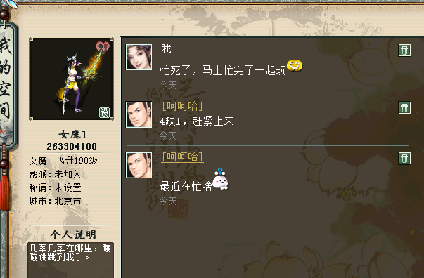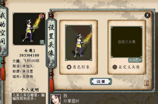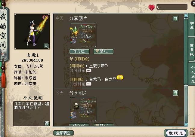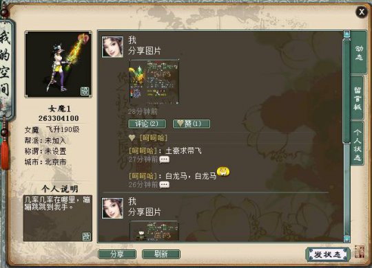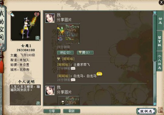 为此,大话西游经典版个人空间即将上线!用自己的手来记录西行的每一步,用更别具特色空间,来彰显独特的个人魅力。 空间一览,动态留言样样俱全 1、空间入口: 个人空间入口,点击好友列表中的“个人空间”,即可进入。 留言板:朋友们的留言,这些祝福或关心,一定要好好珍藏! 个人动态:自己所走过的大话路,都记录在这里,即使移民也会保留下来,和时光一起做见证者吧! 设置头像:你可以在这里设置自己的头像,突显独特的性格。 发状态:你可以在这里发布自己的心情状态,可以是一段文字,可以是一张图片,让大家一起分享你的喜怒哀乐吧! 玩转空间,空间达人非你莫属 1、头像设置: 点击左上角的“设”,进入设置头像界面,一转以上的玩家可以选择本地电脑中的图片作为头像,打开图片后等待上传,上传成功就可以用个性的图片作为头像啦! 不过要注意的是,每位玩家在1小时内只能成功上传一次头像,上传失败不计入次数。上传的头像会在24小时内审核完毕,通过审核后,各位的个性头像就可以被所有人看到啦! 2、发状态 大话中的点点滴滴都记录在这里,你可以选择发送文字,也可以选择一张图片,图文结合最是美妙。 把你的心情状态分享出来,西游的喜怒哀乐一起体会! 3、评论和点赞 评论的前提是双方互为好友,点赞则不需要是好友,当发送状态后,好友就可以对你的状态进行评论或者点赞的操作啦! 是不是很好奇好友会给你怎样的评论呢?看看你的状态能否得到大家的赞同呢! 当然别忘了也要给好友进行评论点赞的互动哦! 4、留言板 好友给你的留言都存放在这里,你可以每天看看都有谁送来了祝福或俏皮话,你也要记得去给好友留言哦,虽然说君子之交淡如水,可是我们渴望的毕竟是浓厚热烈的友谊不是吗? 同样你也可以在留言板中留言来和好友进行对话互动哦! 5、个人状态 个人状态将会记录你所有发布的内容,即使移民也会保留下来。 都说老酒弥香,都说老友知心,当未来的你看到这一切时,会不会动容,会不会怀念这段热血西行的旅途? 空间排行,独特称谓等你来夺 空间排行榜 根据每周玩家获得点赞的人气值,显示进入榜单的前100名玩家,查看榜单的玩家可进行刷新排名,也可通过排行榜进入其他玩家空间。 排行榜每周一8点结算,结算后,前三名玩家根据排名分别获得以下称谓: