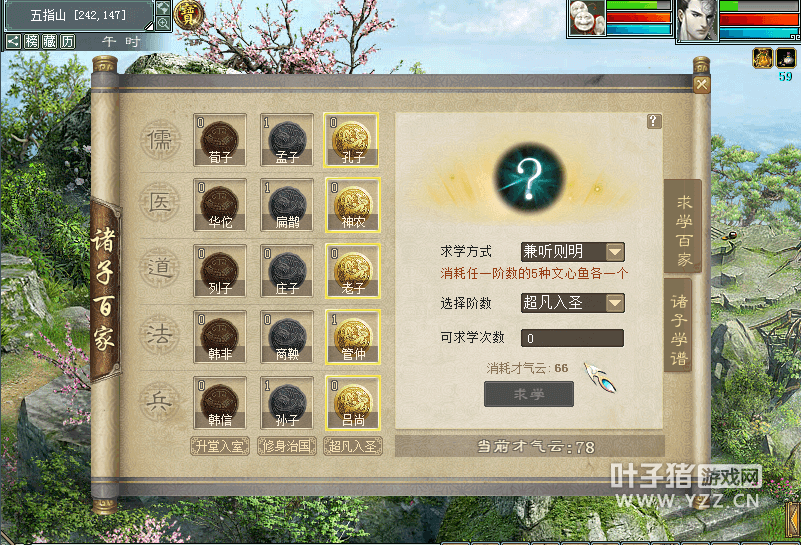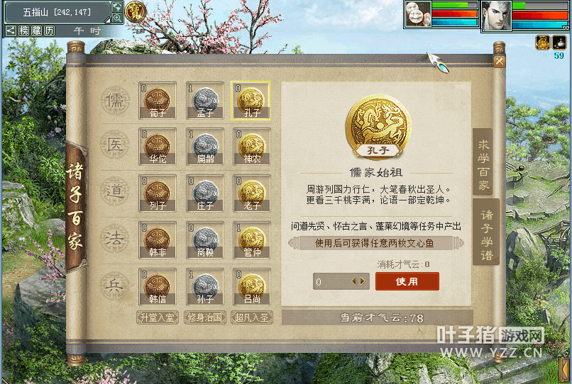 可使用文心鱼进行求学问道,有一家之言、兼听则明、百家争鸣三种方式。求学后可得物品奖励。 若是直接使用文心鱼,可得经验或物品奖励。(特别地,使用1枚高阶文心鱼,可得2枚新的文心鱼) 每次操作需消耗一定才气云,才气云可在百家门徒、问道先贤、怀古之言等任务中获得。 一家之言:消耗同一门派的三种文心鱼各1个共3个进行抽奖,可获得一般物品奖励。 兼听则明:消耗相同颜色的五种文心鱼各1个共5个进行抽奖,可获得贵重物品奖励; 百家争鸣:消耗全部种类文心鱼各1个共15个进行抽奖,可得更贵重物品奖励。 使用文心鱼