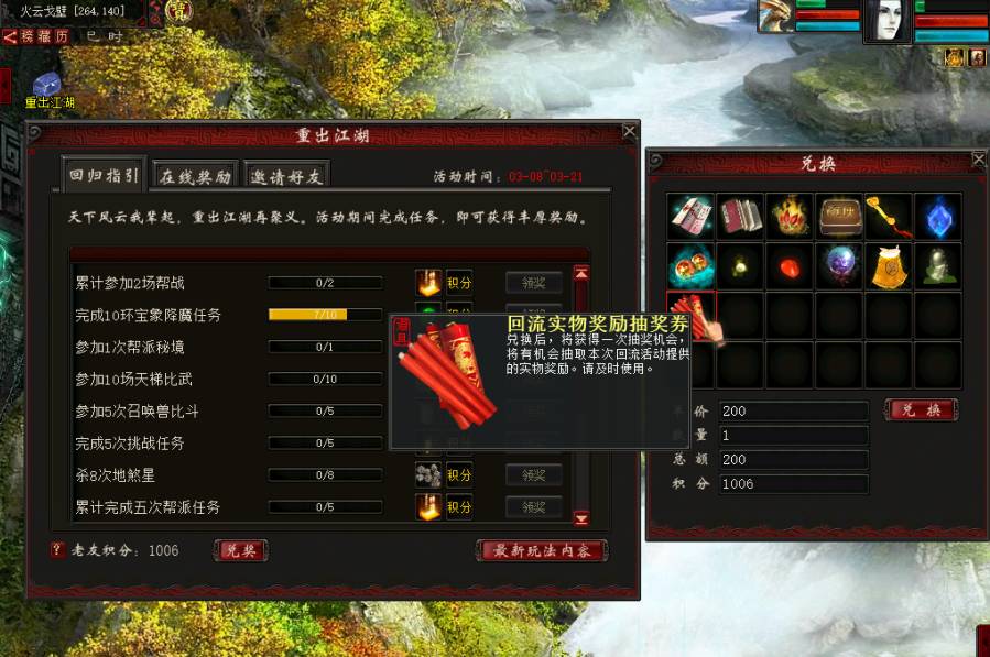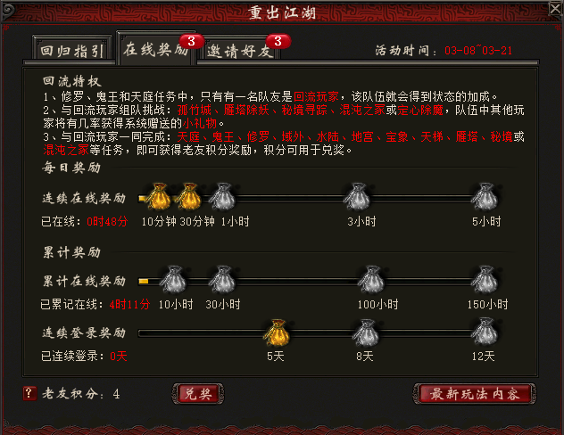六大福利惊喜派送,重出江湖情义再聚! 2018回流活动“重出江湖”现已正式上线。即日起至3月21日,所在服务器于2月8日前开放的玩家都可邀请好友回归,获取丰厚奖励;回流玩家更有专属特权,赢得海量福利。快邀好友重出江湖,一起闯荡大话三界,与好友尽享六大福利回流福利,赢鎏金宝鉴、精美角色手办、黑檀镶银丝手珠、游戏周边等豪华实物奖励! 回流玩家 专属特权量身打造 回流玩家登录即送回流尊享礼包,内含4级飞行器体验券、神兵兑换券、孔明灯、帮贡等。此外,回流玩家还将获得专属单人任务重出江湖,完成即送上专属奖励!修罗、鬼王和天庭等常规任务中,回流玩家还能给队伍额外buff加成。而回流玩家每完成一个副本,更将产生一份小奖励,随机发给队友。每日帮派活动中,回流玩家成功答对回流题目,完成帮派组队任务或参与帮战,除了自身可得大量经验,帮派还可获得大量资金。 非回流玩家 邀请好友实物抽奖 活动期间,3转143级以上玩家,可邀请好友重出江湖。累计成功邀请回1位、3位、5位好友,可分别获得1次抽奖机会。此外,在老友积分兑换界面,可使用200老友积分兑换1次抽奖机会。抽奖即有机会获得包括2017年鎏金宝鉴白金版/珍爱版、大话西游主角手办、黑檀镶银丝手珠、大话西游15周年T恤、大话西游抱枕、大话2鼠标垫等在内的豪华实物奖励。 所有玩家 多重福利情义共享 回流期间,所有玩家都可通过与回流玩家组队完成任务,每日积攒老友积分,用于兑换包括回流奖励抽奖券、神兵体验券、召唤兽技能、回流奖励抽奖券等丰厚奖励。 活动期间,每日在线满一定时间,均有经验奖励或香火1根。累计在线时间与连续登陆天数若满足一定条件,则可得相应的物品奖励、积分奖励或者经验奖励。 此外,玩家每日可组队击杀回流使者与回流吉祥物,可得经验奖励以及老友积分,还能获得包括龙之骨、混元丹等在内的随机贵重物品奖励。