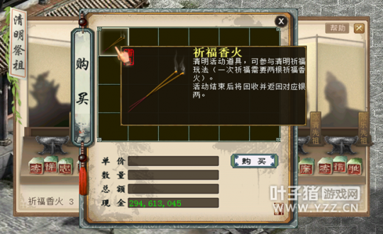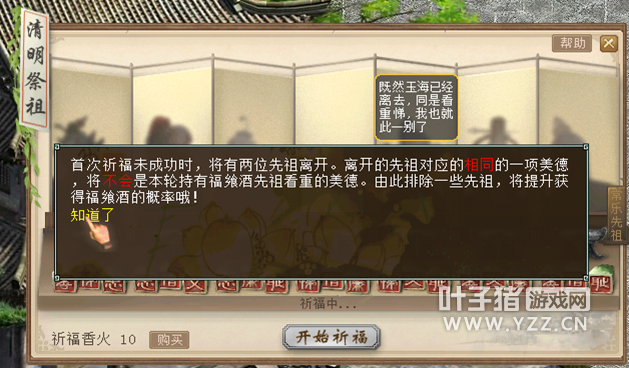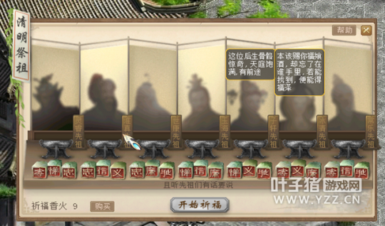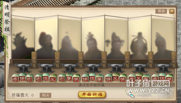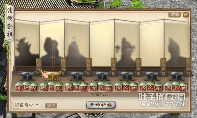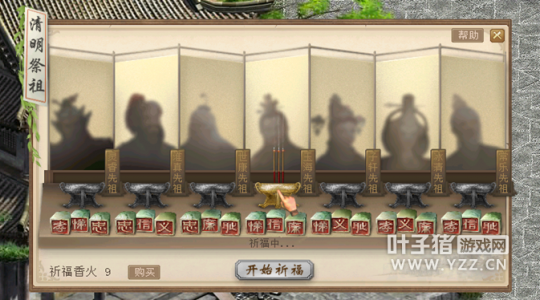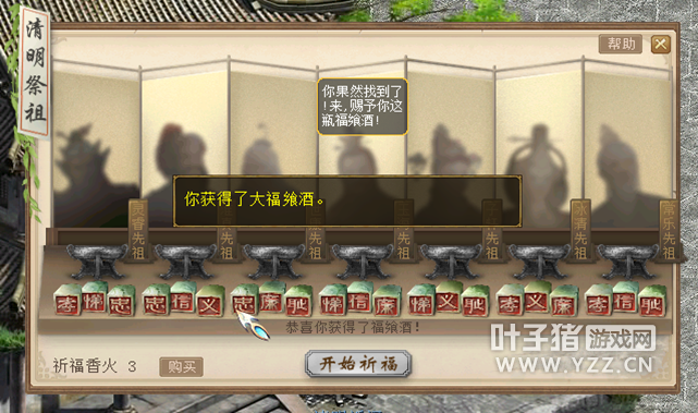 六、单人:清明祈福 活动内容 活动时间:2018年4月5日00:00至4月8日23:59 参与条件:当日完成10次[鲤庭问德]玩法。 活动流程 到长安城城隍庙附近找到上香家丁打开祈福界面。 购买祈福香火。 开始祈福。 选择一位先祖,点击他身前的香炉进行祈福。 若首次祈福未成功,将会有两名先祖离开。留意离开先祖所看重的美德,猜测福飨酒在谁手中。 再次选择一位先祖,点击他身前的香炉进行祈福。 获得奖励。 活动奖励 每轮第一次求签成功,将获得大福飨酒奖励;每轮第二次求签成功,将获得小福飨酒奖励;右键使用福飨酒,可换取金钱、师贡或高级物品奖励。 物品奖励包括: [编辑:admin]