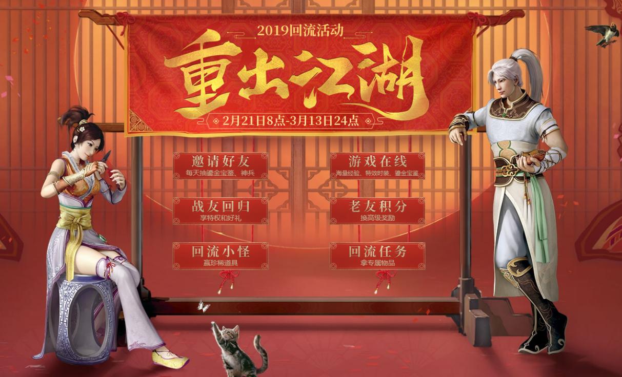 老友回归再聚首,重出江湖任遨游!2019回流活动“重出江湖”现已正式上线。邀请老友回归,每天都有机会抽取鎏金宝鉴水月镜花、龙马、年手办、神兵等惊喜奖励。赶快召回你暂别江湖的兄弟们,一起并肩作战再续情义吧! 邀老友回归 每天抽鎏金宝鉴、神兵 邀请老友回归,一起并肩再战、闯荡江湖!即日起至3月6日,大于等于3转的玩家,点击游戏内的“重出江湖”按钮,即可开始“召回老友”。每位玩家可发送20次免费召回短信,成功召回老友后即可进入“召回老友排行榜”,排名前15的玩家还将得到我们的嘉奖哦!除此之外,归来人更是准备了丰厚的豪礼:鎏金宝鉴水月镜花、龙马、年手办、主角手办、神兵、终极技能修炼丹、宝石精华……是不是很心动?那就千万不要错过! 藏宝阁专属活动 买角色赢免单 为了迎接大家的回归,今年我们推出了藏宝阁回流专属活动!3月4 日10点,藏宝阁活动将正式开启,买角色抽免单、答题赢百元券、回流玩家专享福利等专属惊喜等你来拿!记得将藏宝阁APP更新到最新版本参与活动哦! 更多回流福利 助你重出江湖 活动期间,“重出江湖”六大回流玩法同步开启。除了“邀请好友”之外,还有“游戏在线”、“战友回归”、“老友积分”、“回流小怪”、“回流任务”助力你重出江湖。只要每天连续在线,即可轻松赢鎏金宝鉴、特效时装、珍稀道具和海量经验;回流玩家还将获得专属礼包、专属称谓和畅玩特权;与回归战友结伴同游,即可积攒老友积分换取高级奖励;参与回流小怪和回流任务,更能获取珍稀道具和专属物品! 2月21日至3月13日,“重出江湖”回流活动情义开启,海量豪礼邀你重回大话!赶紧邀请老友回归,赢取鎏金宝鉴、神兵、年手办等惊喜福利吧! <<<点击进入大话西游2论坛讨论>>> [编辑:韦小贝]