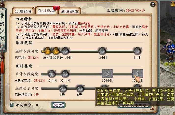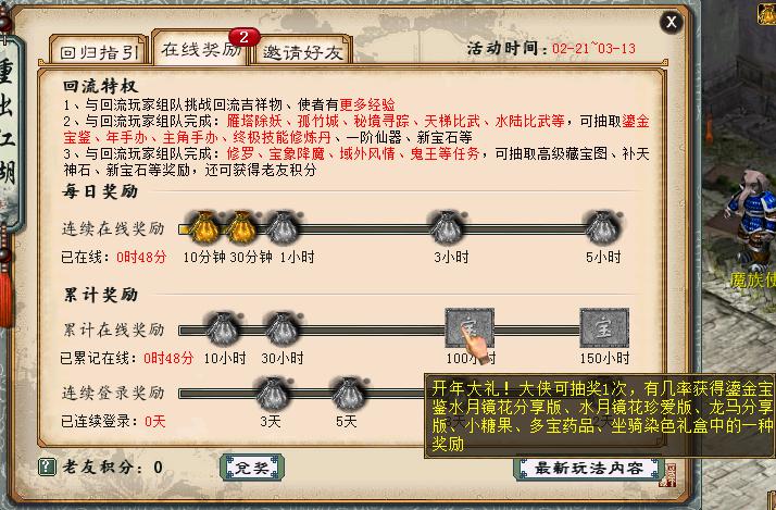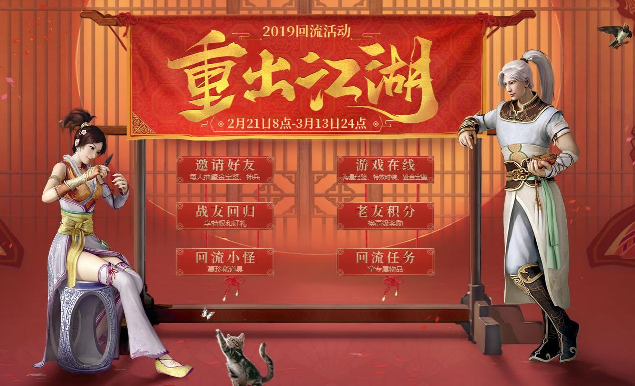 好久不见,你还好吗?2019回流活动“重出江湖”正在火热进行中。活动期间,只需每日登录游戏,保持游戏在线就能获得海量经验、稀有变身效果、外观道具等奖励,更有几率拿鎏金宝鉴水月镜花、龙马哦! 每日游戏在线 赢取鎏金宝鉴 天下风云我辈起,重出江湖再聚义。2月21日至3月6日,只要每日连续在线满10分钟、30分钟、1小时、3小时、5小时,均有经验奖励或香火1根。连续登陆3、5、8、12天还能获得白薇雪莲丸药盒、佩兰玄参丸药盒、六脉化神丸、玉枢返虚丸等稀有药品。累计在线10小时、30小时、100小时、150小时,更能获得稀有变身效果、多宝药瓶、小糖果、外观道具等奖励,并有几率获得鎏金宝鉴水月镜花和龙马!只要在线就有这么多福利?心动不如行动! 六大回流玩法 助你重出江湖 除了“游戏在线”,还有更多福利活动助你重出江湖。结交好友、助力回流玩家完成修罗、域外风情、宝象伏魔、天梯比武、水陆大会等任务,还能获得丰厚积分奖励和随机物品奖励。帮派成就册、高级藏宝图、年手办、主角手办、鎏金宝鉴等丰厚奖励,通通几率可得!参与“召回老友”活动,进入排行榜,每天都有机会抽取鎏金宝鉴;与回归战友结伴同游江湖,还能共享特权和好礼,积攒老友积分换取高级奖励;参与回流小怪、回流任务,更能获取珍稀道具! “重出江湖”回流活动现已情义开启,海量福利邀你重回大话!鎏金宝鉴、精美周边手办、神兵、终极技能修炼丹等惊喜奖励正等你来赢取!兄弟们,是时候回归大话了,一起来书写崭新的三界传说吧! [编辑:韦小贝]