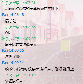 今天给玩家派发周边福利时,一个获奖玩家给米奈说他要胡歌纪念扇,刚好在说相声时可以用用。越聊到后面发现这个玩家不仅可爱,还很有才。 先看看这位玩家Pan给小编米奈发来的一张日常表演的图,你们能猜到照片哪位是他吗?反正小编是猜错了,哈哈! 进入采访 叶子猪米奈:胡歌纪念扇和至尊包你喜欢哪个? Pan:多谢了哈,哈哈,我有时候会表演相声,刚好能用上 叶子猪米奈:一般在哪表演?果断交出你的表演照片瞅瞅。这个是你吗? Pan:女的是我,我一般唱花旦。我演出的照片我自己很少,除非上我们俱乐部那里找去,有机会给你展示几段 叶子猪米奈:必须看个正脸,哟,原来是个帅小伙。 原来是个帅小伙