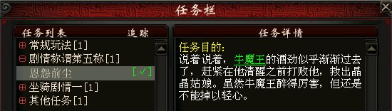 果然“牛魔王”也醉了,趁着他醉酒,先将他打败。 牛魔王血量6W,牛虱血量3W,会仙法及物理攻击,战胜后获得经验30W。 战胜了牛魔王,赶紧去救出“晶晶姑娘”(大唐边境500.130)。 将晶晶姑娘救走,斧头帮不能呆了,只能先赶往盘丝洞。获得“孽海情天”。 任务结束,前往领取称谓。并获得10点剧情声望。 |