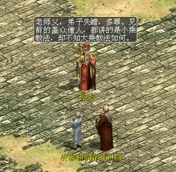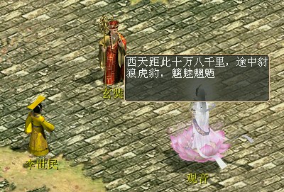 进入剧情设定:疥癞和尚赠送了玄奘袈裟和锡杖,并宣扬“大乘佛法”,“李世民”亦表达了对“大乘佛法”的期待,并让“玄奘”前往取经。“观音”姐姐出现,让玄奘找到陪同前往取经之人。 |