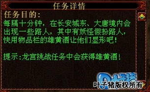 四、雄黄辩妖: 玩家在挑战龙宫宝境之后,兑换每轮奖励时,将有一定几率得到雄黄酒,拿着雄黄酒到长安城东或大唐境内找到路人, 可以触发雄黄辨妖的玩法。 ——————————————————————分割线———————————————————— 端午时节,连妖怪也会出来乔装捣乱,而雄黄酒自古有辟邪除恶的功效,玩家将雄黄泼到路人身上, 可辨别对方是妖是人,若对方是妖,那么妖怪显形遁逃,玩家可以获得奖励。 泼对了,就给奖励哦~ 若是泼错了,嘿嘿…… 就要接受惩罚啦! 更多游戏资讯请访问叶子猪游戏资讯中心:http://news.yzz.cn/ [编辑:红烧猪肉]