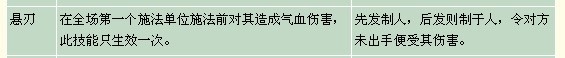 4,悬刃/对全场第一回合第一个出手的单位造成一定的气血伤害。 之所以把这个技能和上面的法术伤害技能分开说,是因为这个技能和上面的技能相比较而言,鸡肋了不少,作用也不是很明显。 很显然从字面上理解,该技能不太可能对敏系单位起到秒杀的作用,如果不能秒杀,那么此技能基本上等于废物,如果能秒杀的话,此技能比上面的造成法术伤害的还牛X。不过归根结底,这两个技能主要都是针对的超敏单位。在PK中的作用很大,反之在任务和BOSS中就基本上没什么用了。