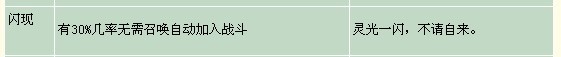 5,闪现/30%的几率无须召唤宝宝自动参加战斗。 这个技能完全是在拼人品和几率,我们先不去说30%的几率有多高,就是这个无须召唤宝宝,自动参加战斗就有很大的疑问? 我身上有十多个召唤兽,到时候这个技能出现时,如果召唤到一个垃圾宝宝怎么办?尤其是召唤个什么泥巴的,一进入战斗就被混,然后帮助对方迅速解决掉自己? 对于这样双重几率的技能,个人并不推荐在战斗中使用,如果你对你自己的人品很有信心的话……另当别论。